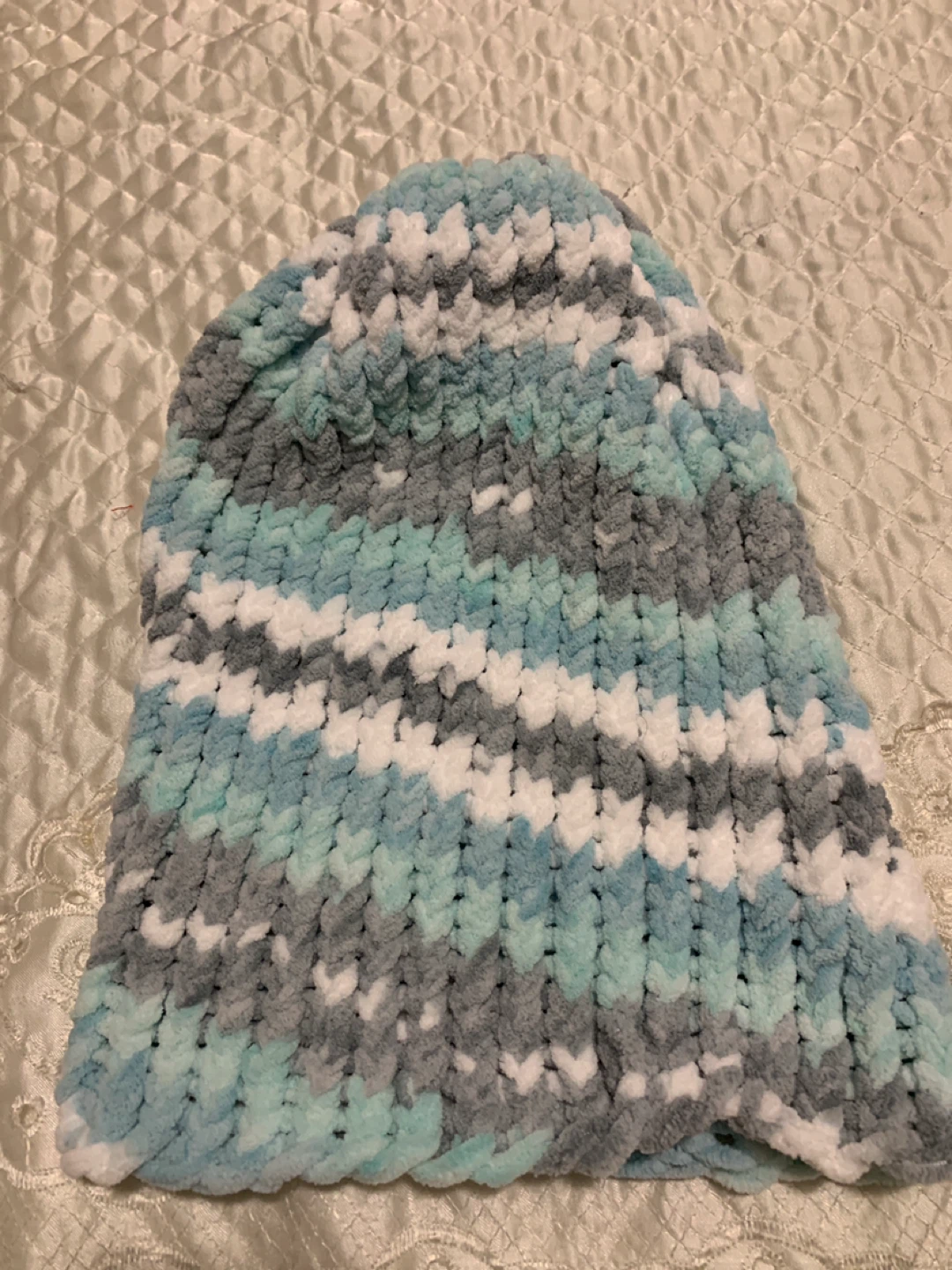Selling a cozy, handmade knit beanie in shades of blue, grey, and white. It's in great condition and perfect for keeping warm during the cooler months!
