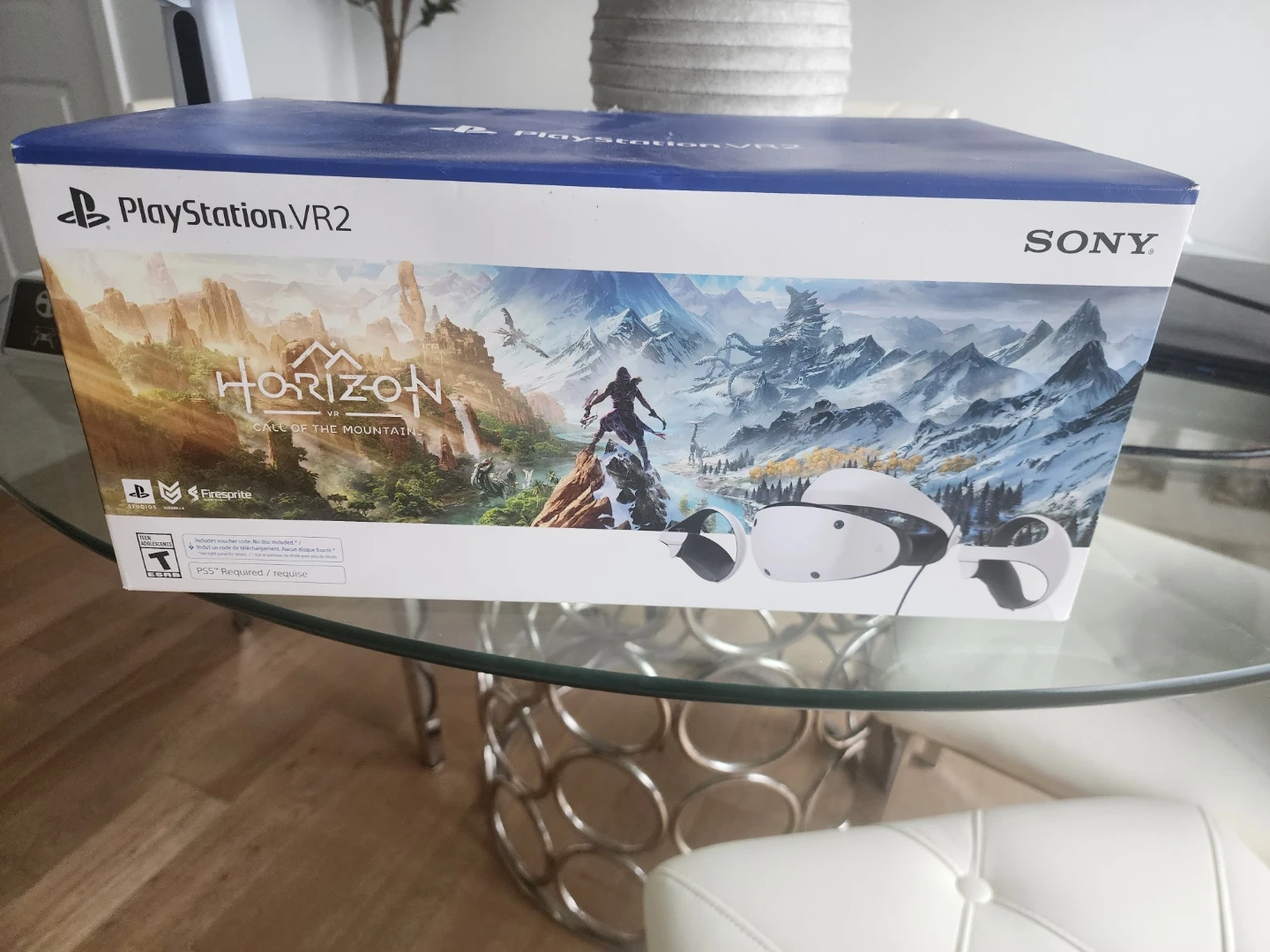 This is the PlayStation VR2 Horizon Call of the Mountain bundle, including the VR headset and controllers. It also comes with a charging station for your Sense controllers and holder for the Virtual Reality Headset. Everything is in the original box and packaging.