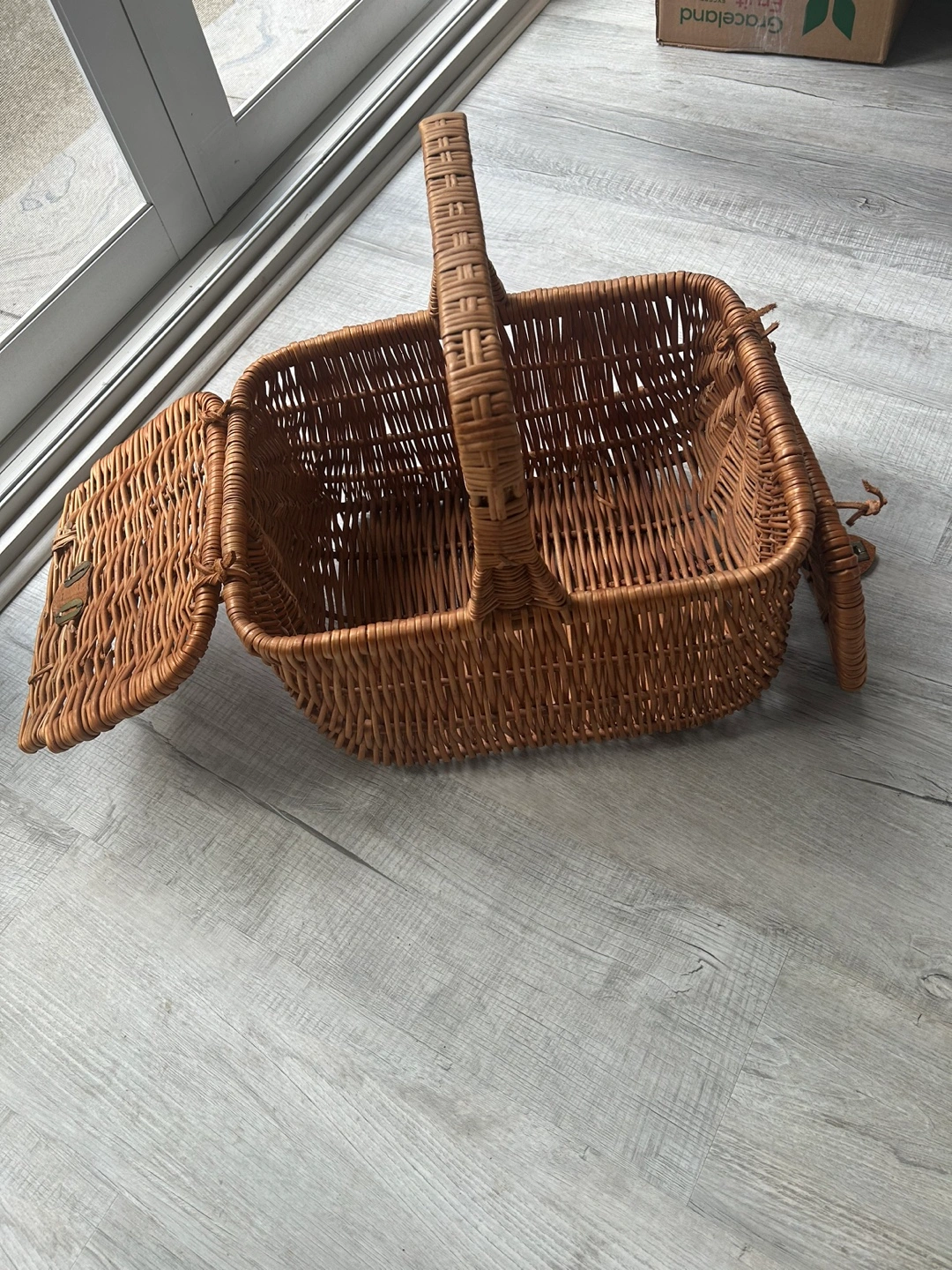 Beautiful wicker picnic basket with a handle and a lid that opens. It features leather straps and a woven design. I hope you enjoy using this basket for a lovely picnic in the park.