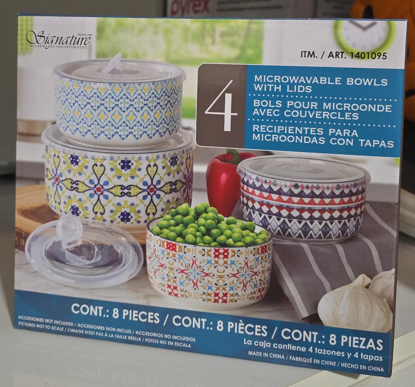 Selling a set of Signature Housewares microwavable bowls with lids! This set includes 4 bowls and 4 lids, making it a total of 8 pieces. The bowls feature colourful patterns and are perfect for storing and heating up leftovers
