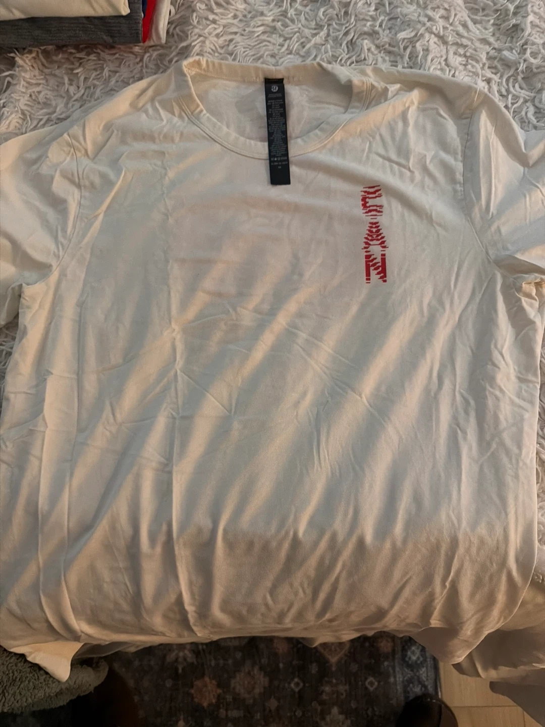 White Lululemon t-shirt with a red stylized maple leaf graphic on the back. It has a small red graphic on the front. Made with comfortable fabric. Size medium