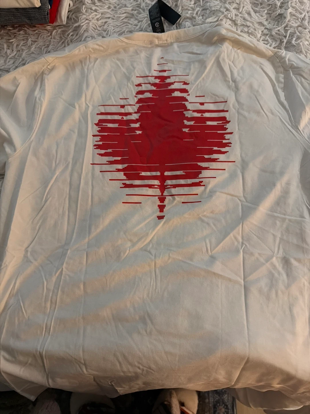 White Lululemon t-shirt with a red stylized maple leaf graphic on the back. It has a small red graphic on the front. Made with comfortable fabric. Size medium