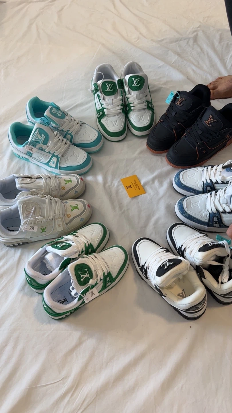 A collection of Louis Vuitton sneakers in various colourways. These are statement sneakers perfect for adding a touch of luxury to any outfit. Various sizes and styles are available.
