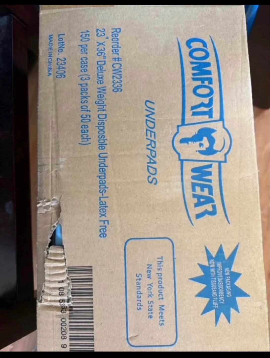 Comfort Wear deluxe weight disposable underpads. Latex-free. 23" x 36" size. Comes with 150 per case, in 3 packs of 50 each. This product meets New York State Standards.