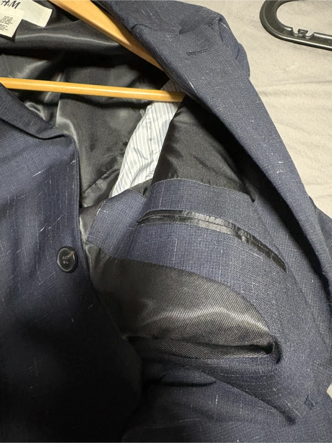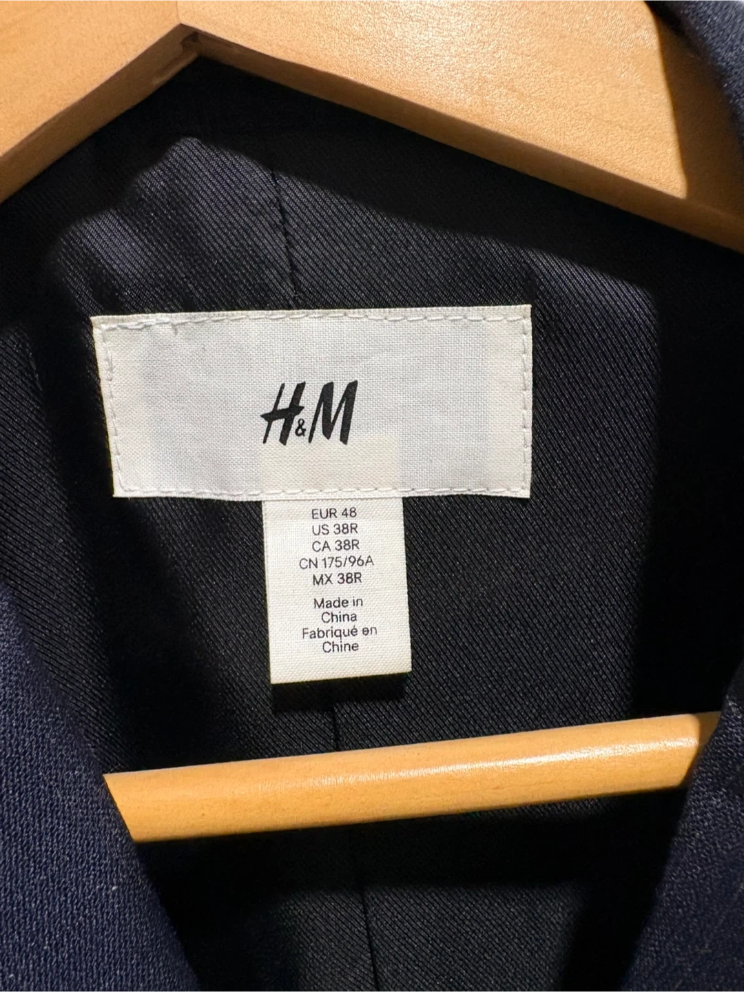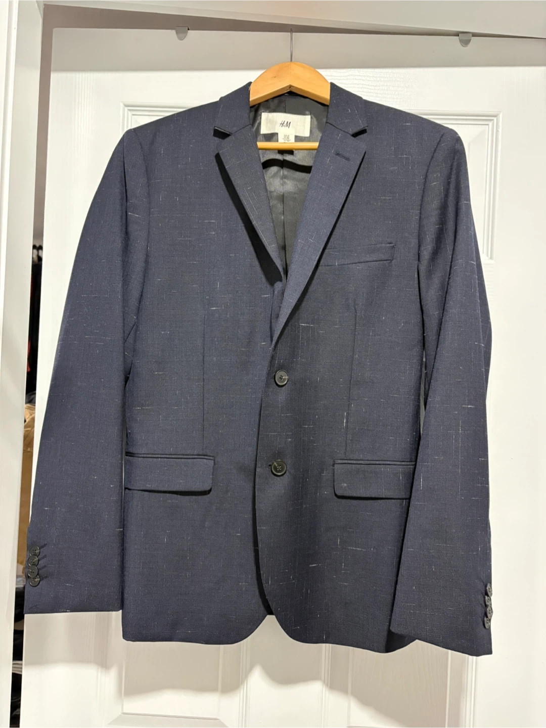 This H&M blazer is a classic navy blue colour with a subtle flecked pattern. It features a two-button closure and front flap pockets. It's a US 38R size, perfect for formal or smart-casual occasions. Made in China.