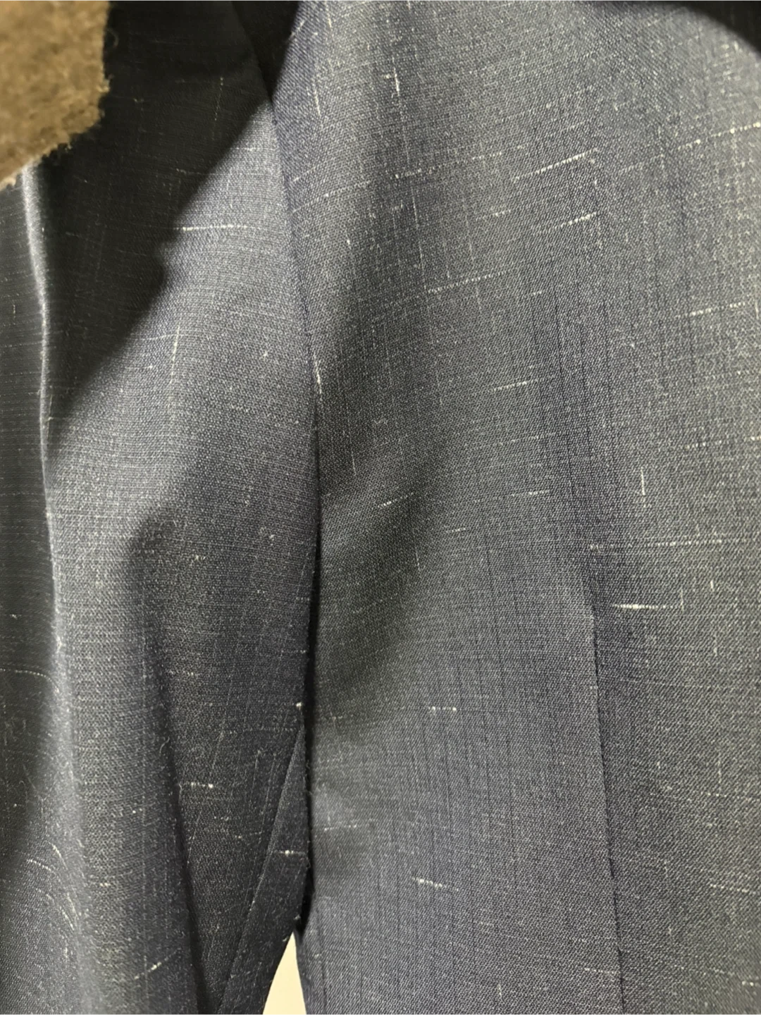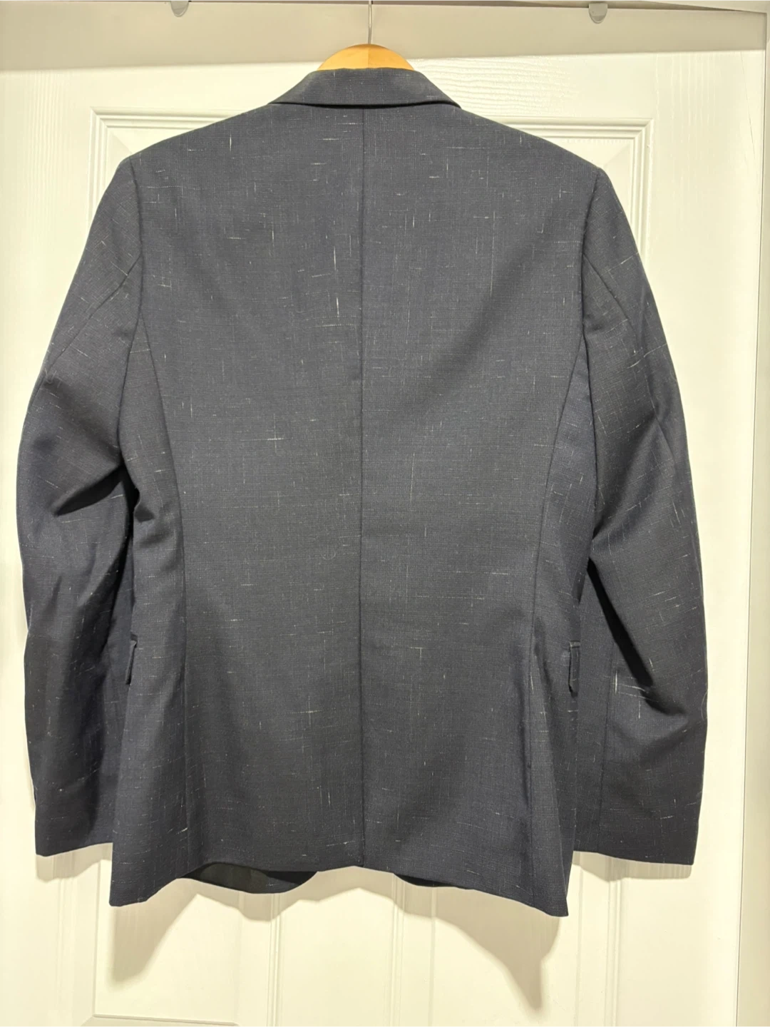 This H&M blazer is a classic navy blue colour with a subtle flecked pattern. It features a two-button closure and front flap pockets. It's a US 38R size, perfect for formal or smart-casual occasions. Made in China.
