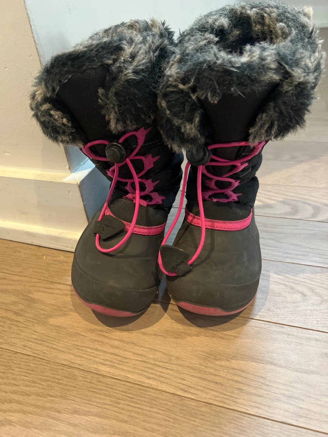 These Kamik snow boots are perfect for keeping little feet warm and dry this winter! They're black with cute pink accents and faux fur trim. The size is size 11.