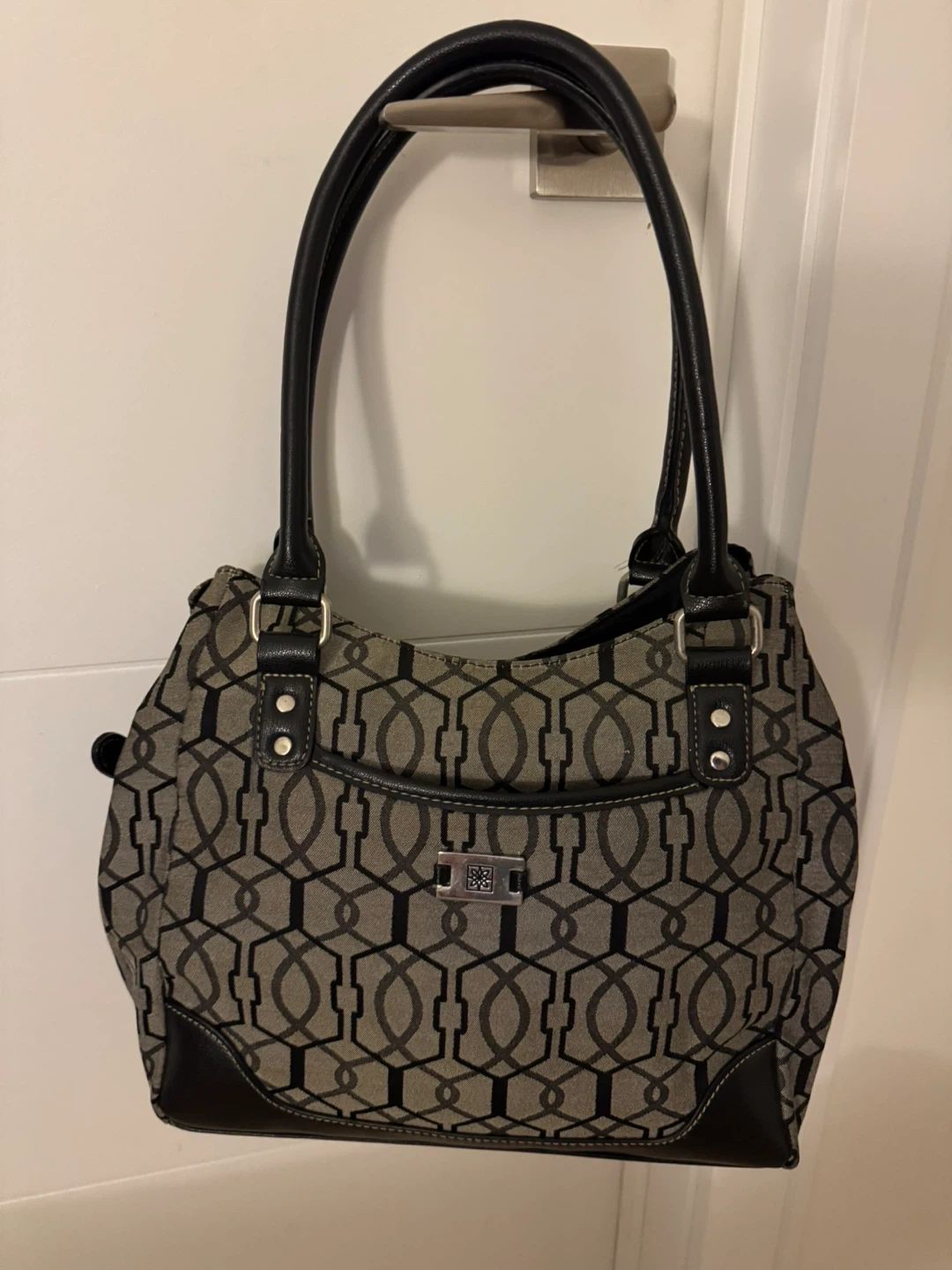 This stylish Nine West shoulder bag features a repeating geometric pattern in grey and black. It has black faux leather trim and handles. It's a great everyday bag!