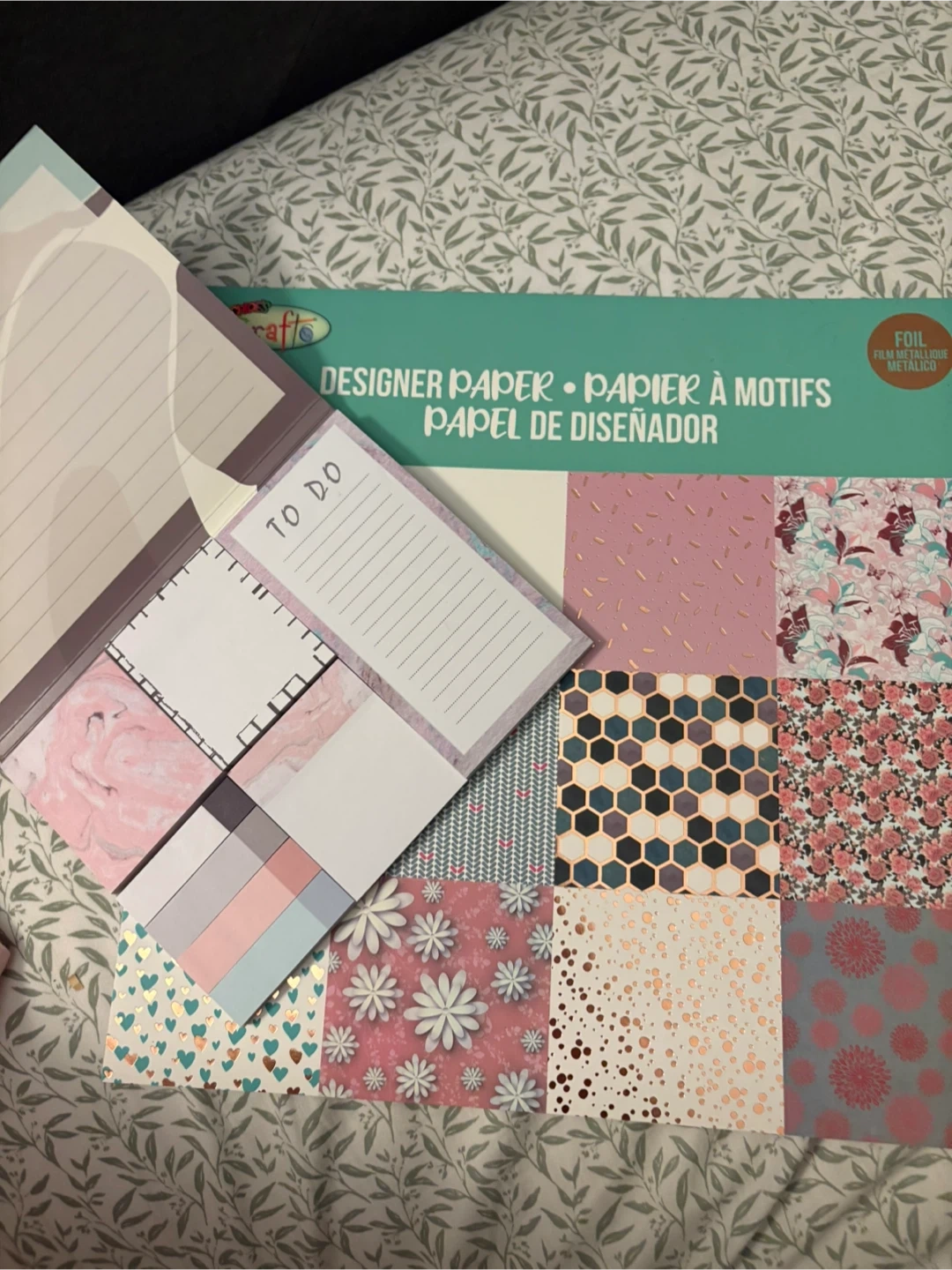 This is a pack of designer paper featuring various patterns, including floral and geometric designs with foil accents. It includes a 'To Do' list notepad. Great for scrapbooking or craft projects!