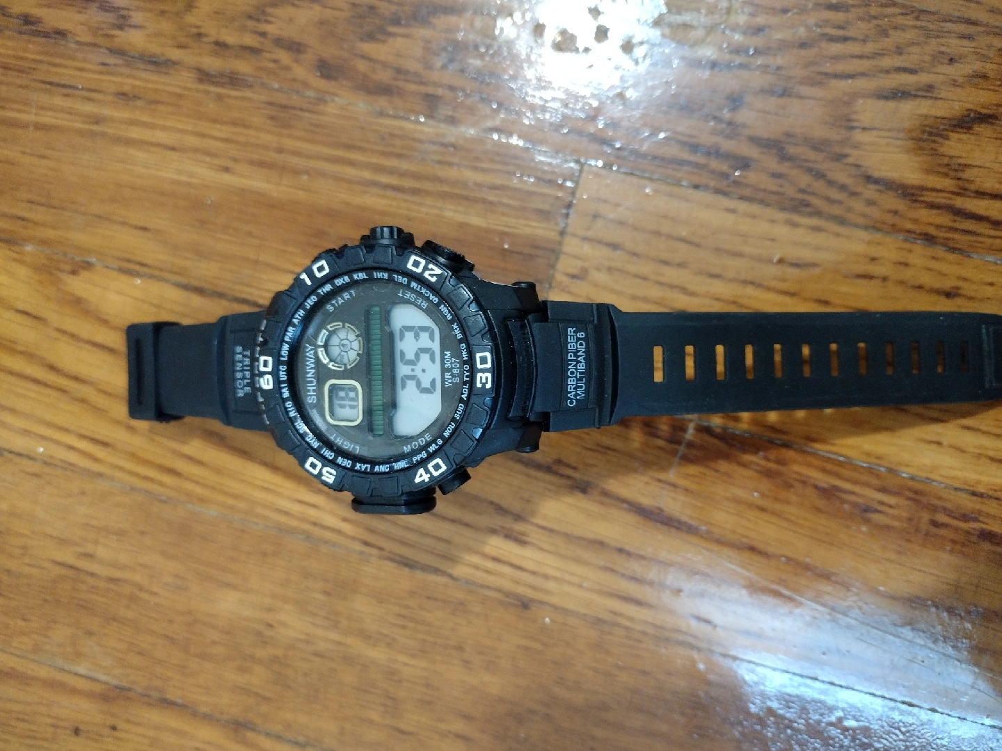 Shunway S-807 sports watch. It's black and in good condition. The watch is water resistant to 30M. It features a digital display.