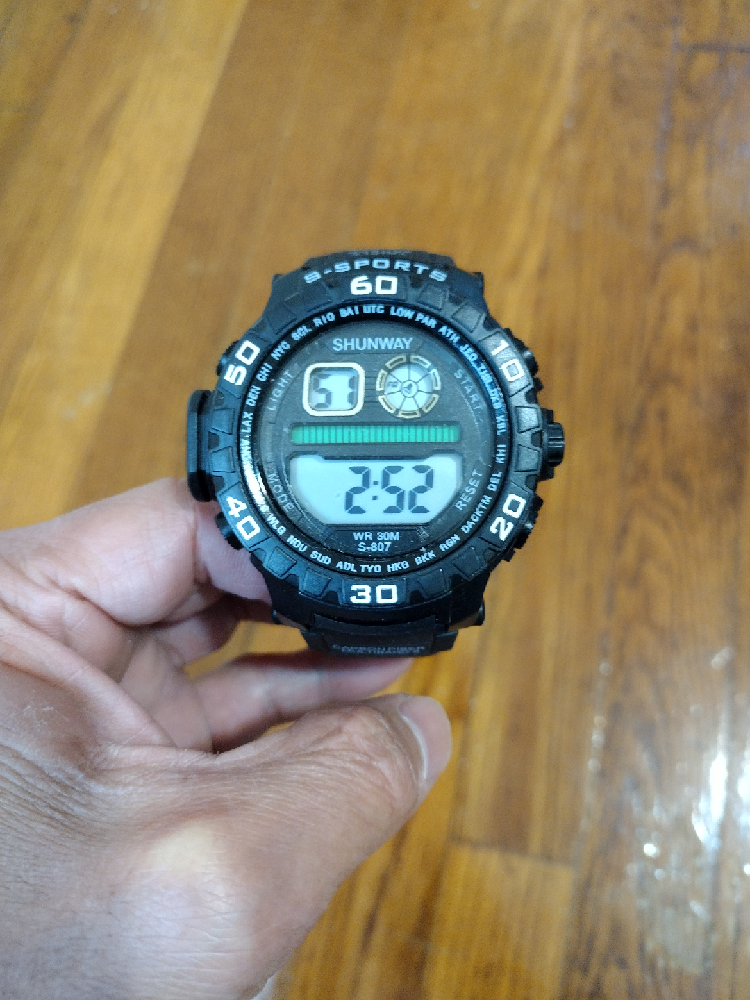 Shunway S-807 sports watch. It's black and in good condition. The watch is water resistant to 30M. It features a digital display.
