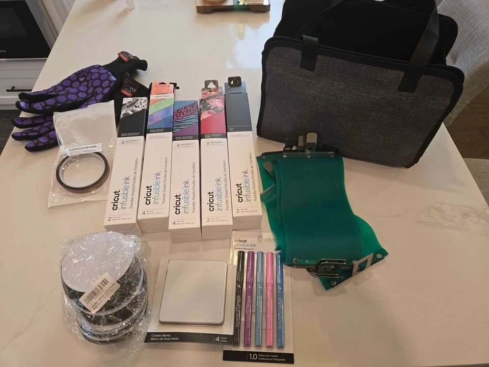 Cricut Mug Press used only 2-3 times. Comes with a ThirtyOne caddy craft bag and various materials. Total approximate value $270-$300. Includes: 5 boxes of Infusible Ink rolls (one roll partially used), brand new Cricut Infusible Ink markers, an open pack of 4 Cricut Infusible Ink coasters, a pack of soft sublimation coasters, heat resistant tape, 4 mug wraps, and heat resistant gloves. Let me know if you're interested!