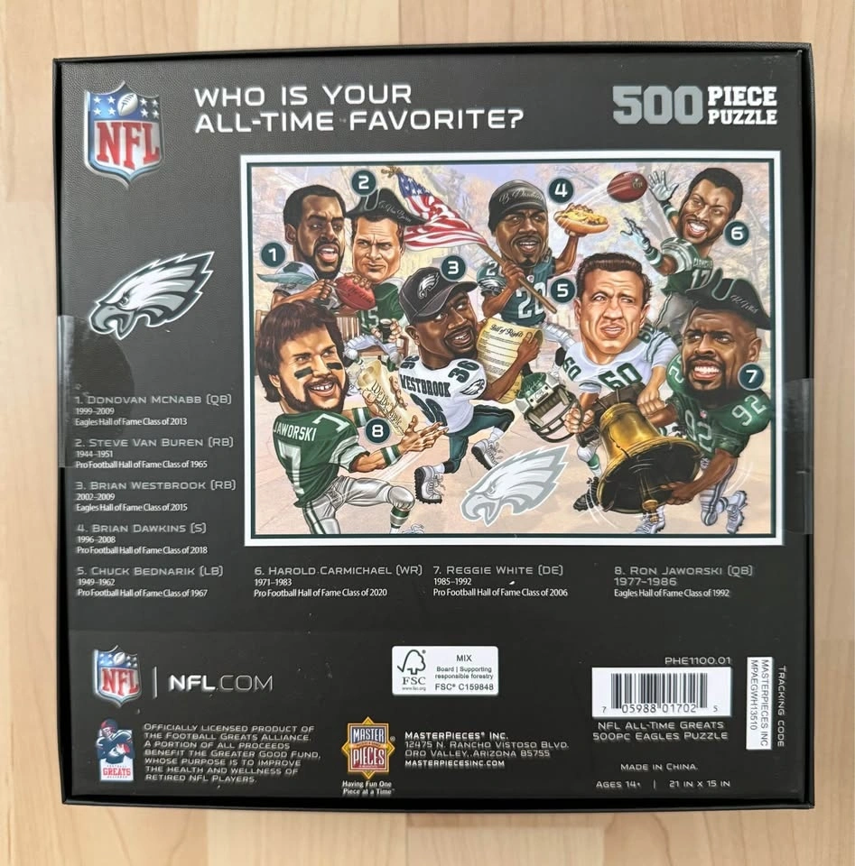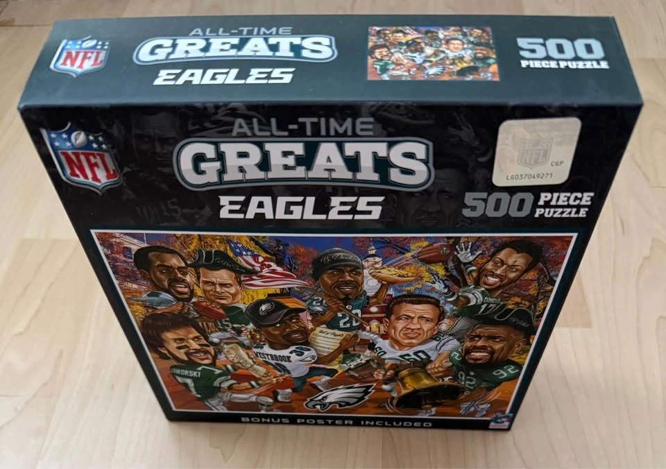 Brand new Philadelphia Eagles puzzle – 500 pieces. Features Eagles legends Brian Dawkins & Reggie White.