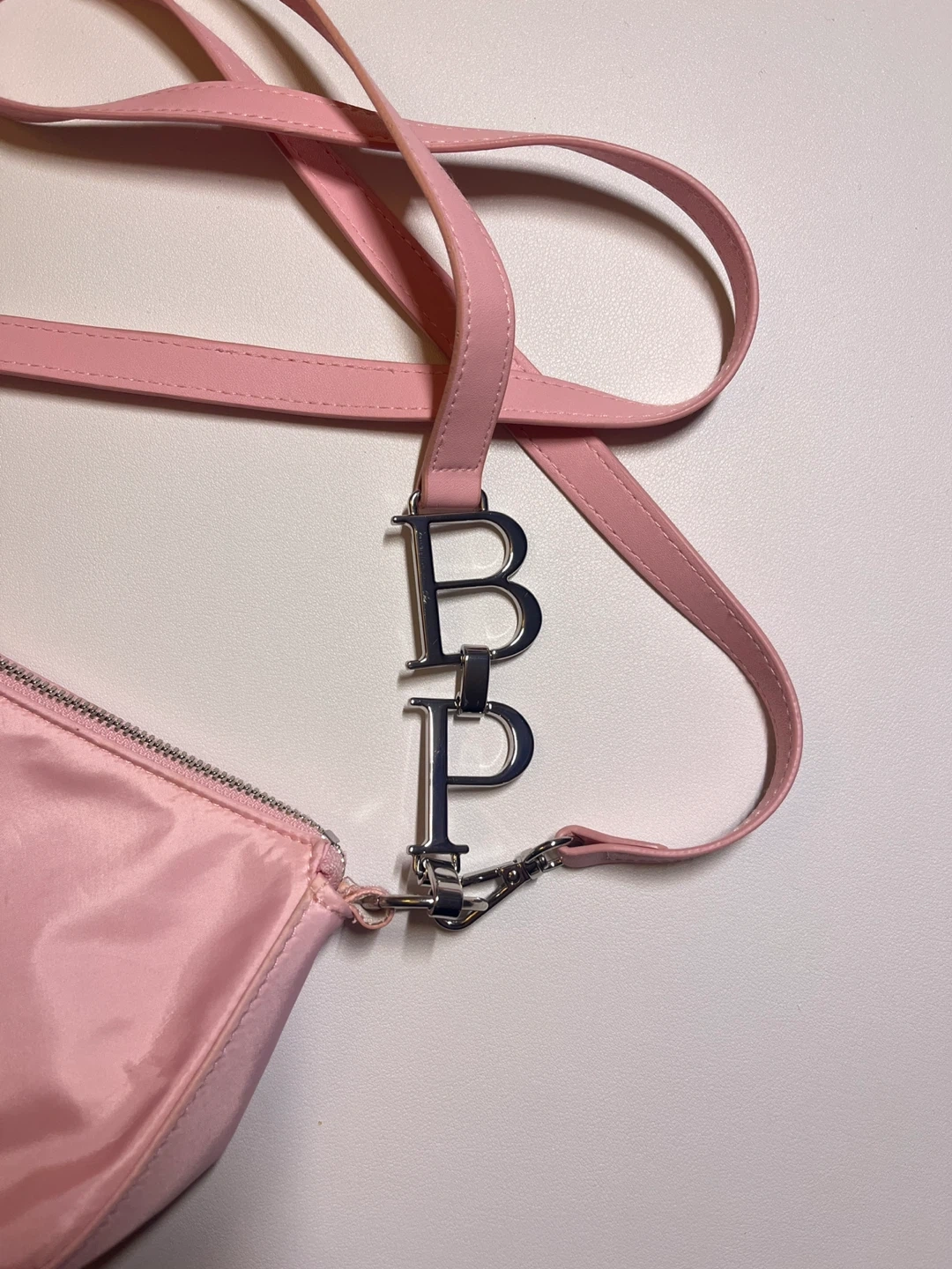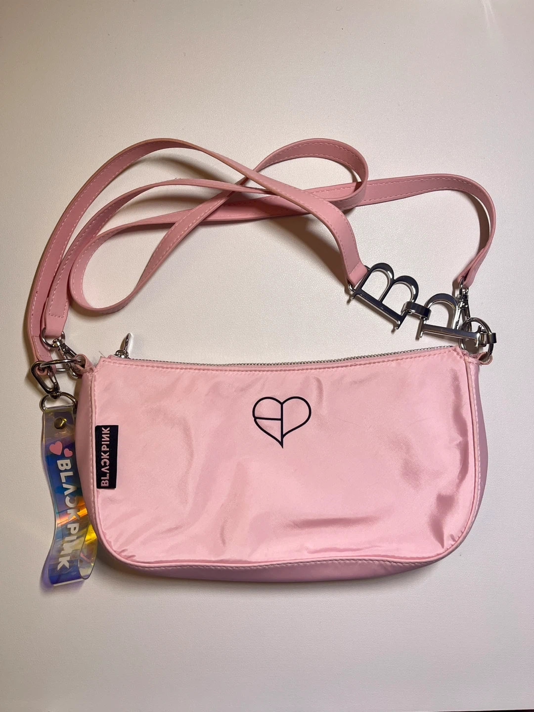 Pink shoulder bag with BLACKPINK branding. Features a zippered main compartment and 2 straps of different length.
