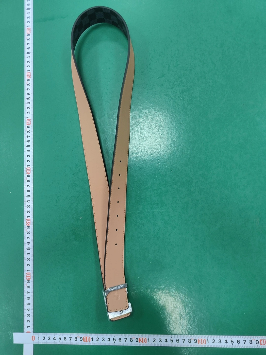 This belt features a light brown leather side and a checkered pattern on the other. The belt has the brand's logo on the buckle, and includes the brand name on the leather. A great everyday piece.