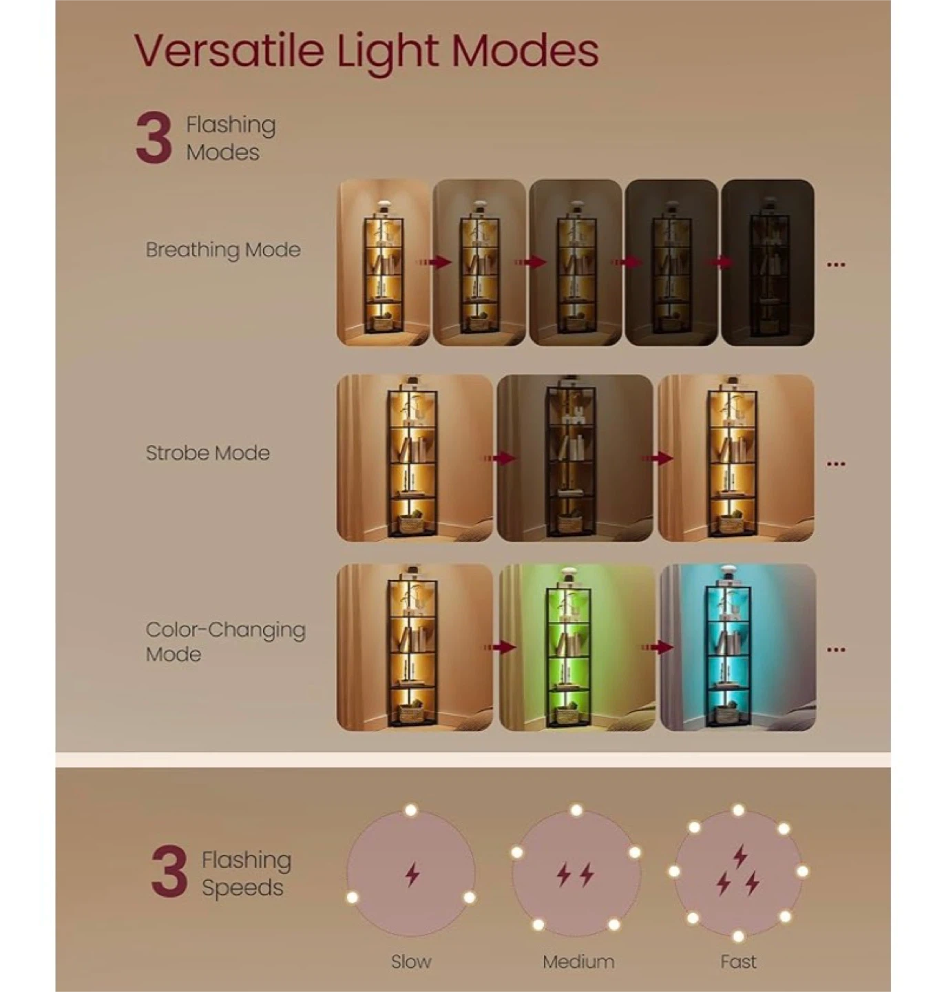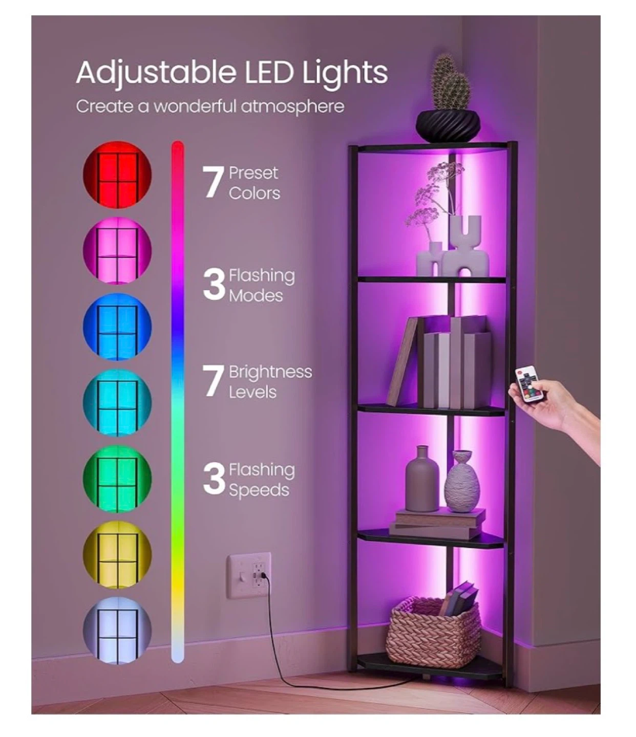 This black corner shelf unit is 57.7 inches tall with a 18.9-inch base. It features adjustable LED lights with 7 preset colours, 3 flashing modes, and 7 brightness levels. Each shelf supports up to 11 lbs (5 kg).