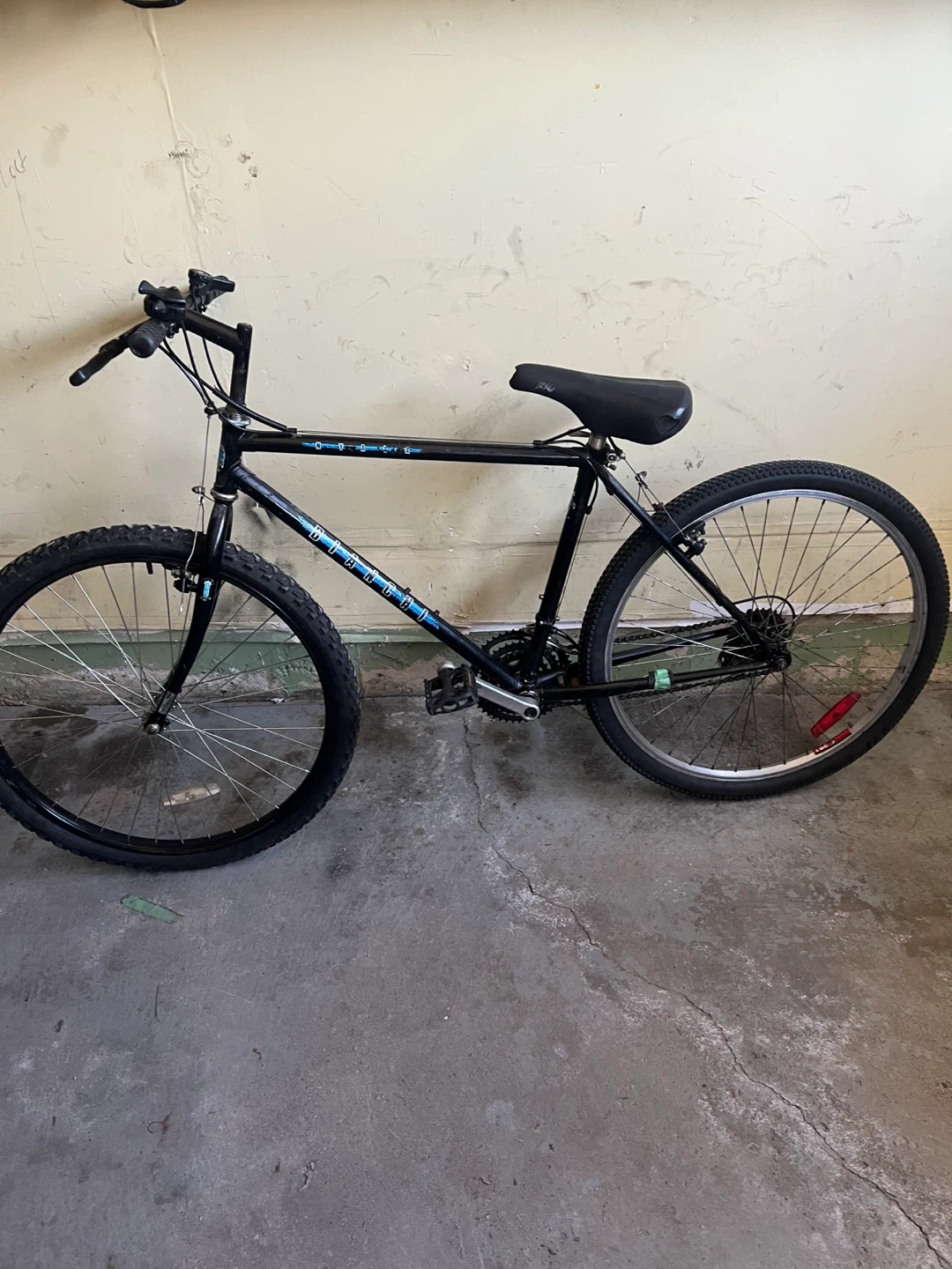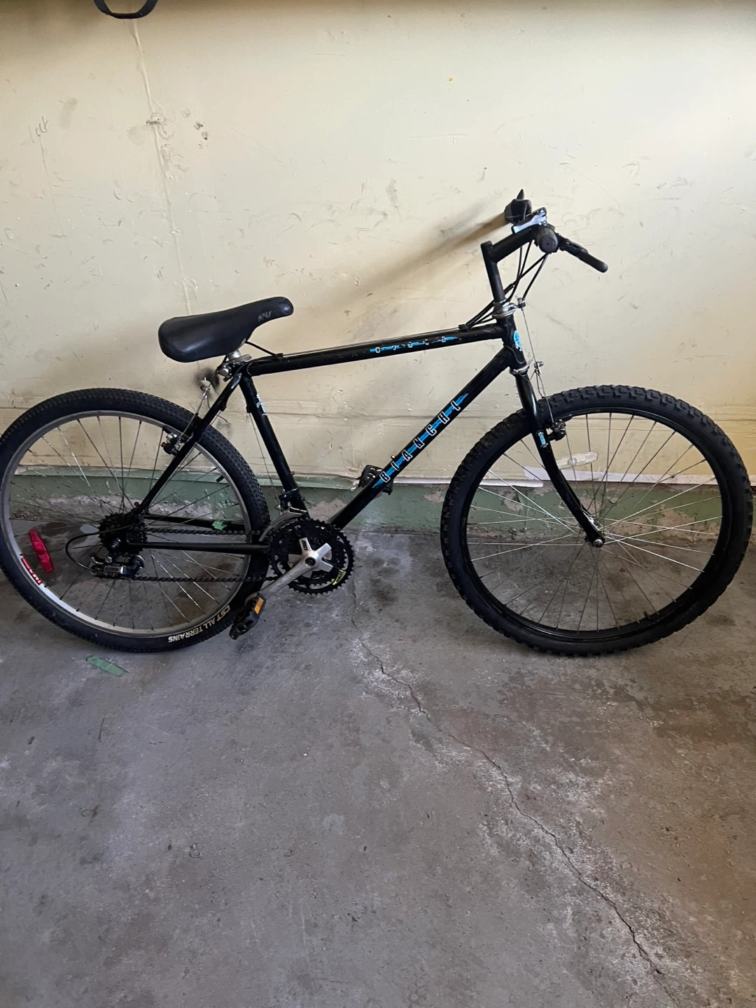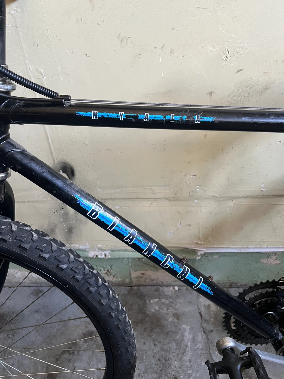Classic black Bianchi mountain bike, model Nyala. It's a reliable ride for trails or city commuting. Brakes, gears, tires all good