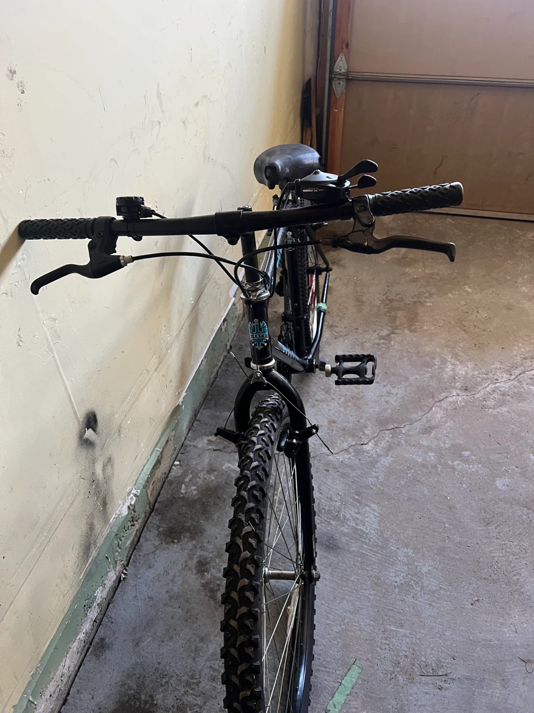 Classic black Bianchi mountain bike, model Nyala. It's a reliable ride for trails or city commuting. Brakes, gears, tires all good