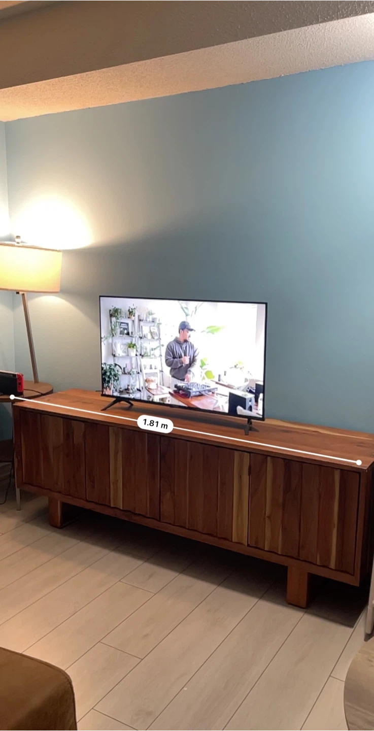 This media console is made from solid wood, offering a warm, natural look for your living space. It has plenty of storage behind the slatted doors. Dimensions are about 1.81 m long, 47 cm deep, and 41 cm high.