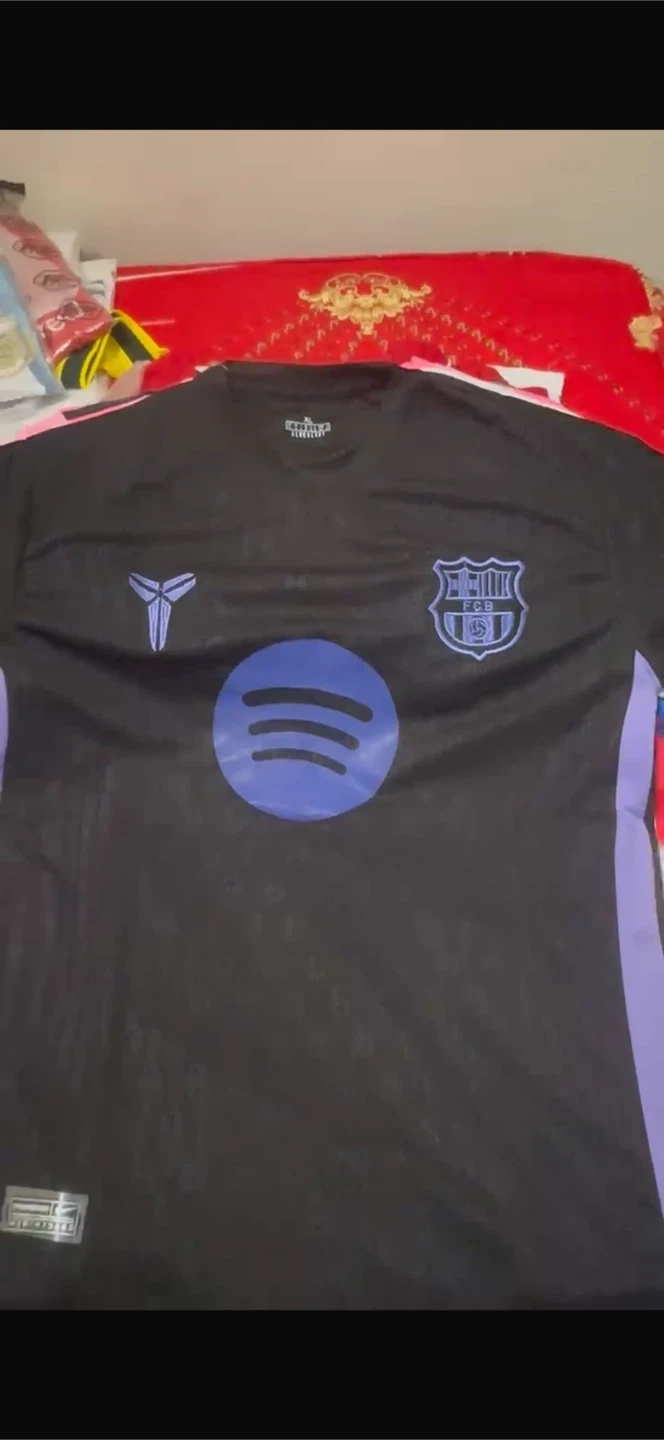 This black FC Barcelona jersey features the Spotify logo prominently. It's a size XL. The jersey has a sleek design with purple accents on the sides.