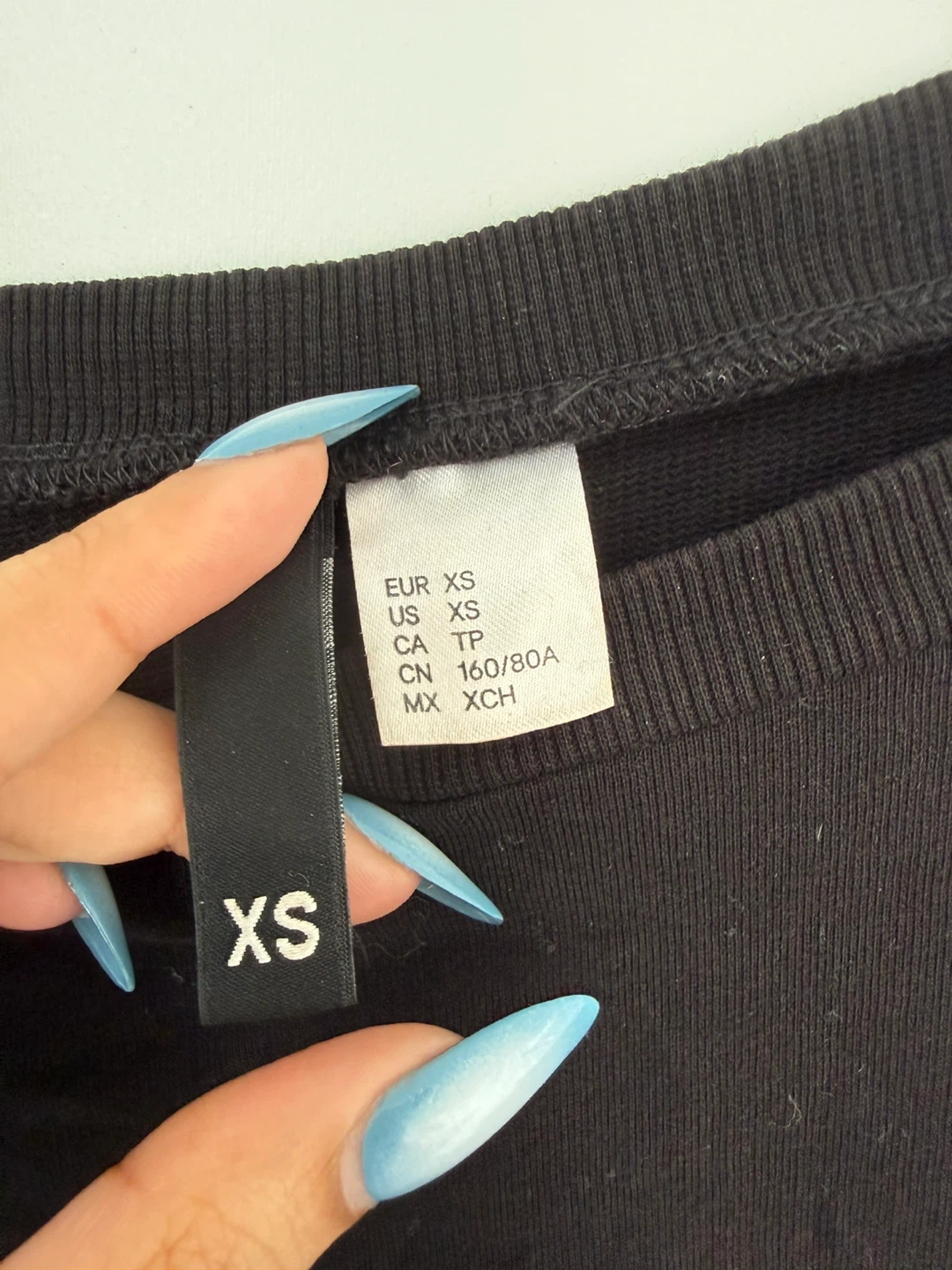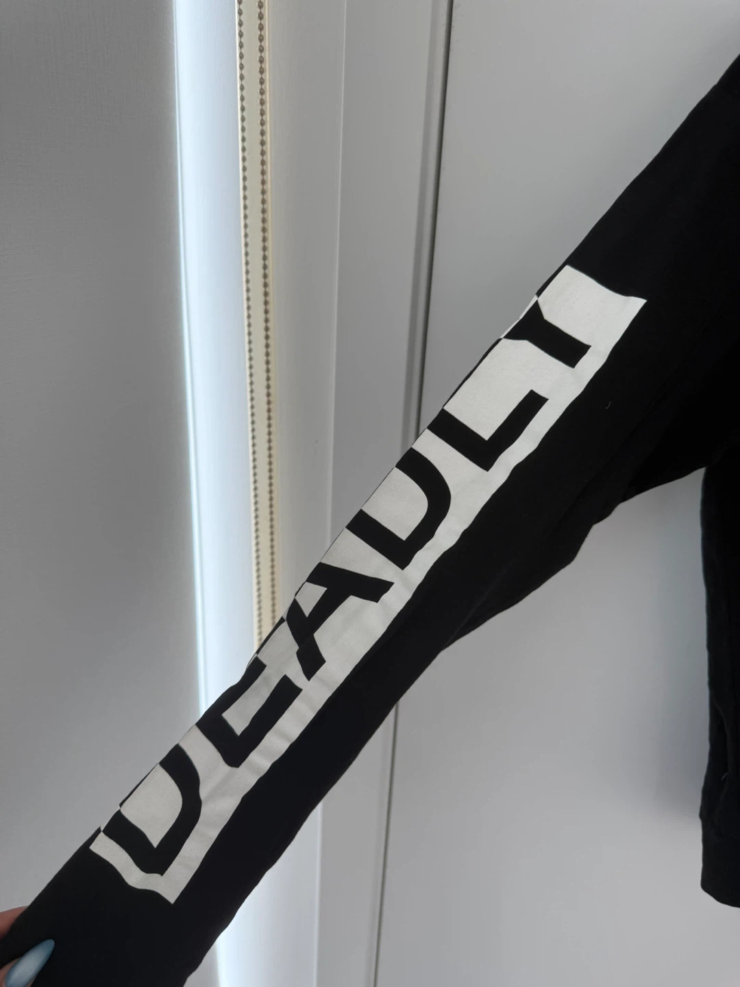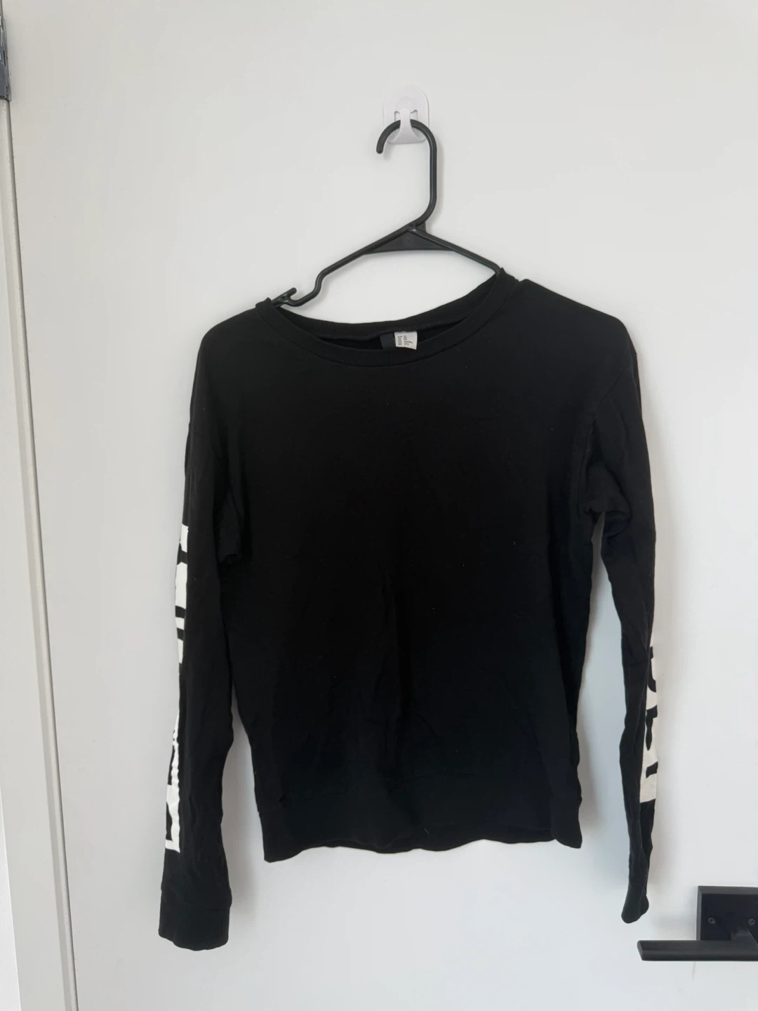 This is a black long-sleeve top from H&M. It's size XS but can fit a size S or M. The sleeves have white text detail saying “Deadly”.