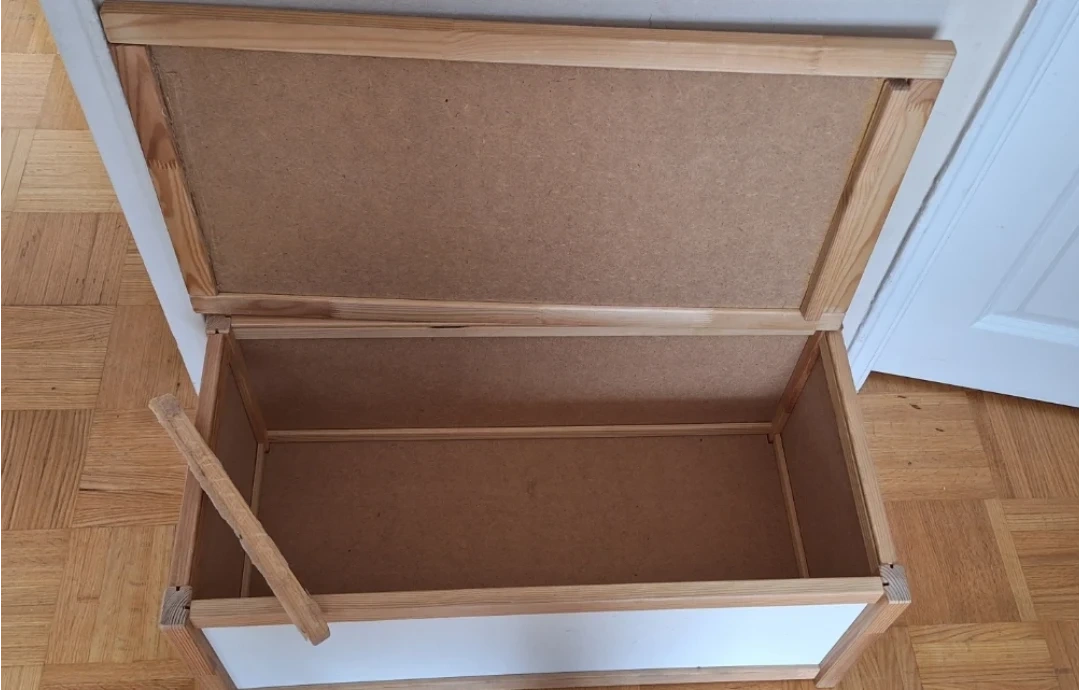 This is a wooden storage box with a white front and lid. It's constructed with a wood frame and particle board panels. It would be useful for storing items like blankets or toys.