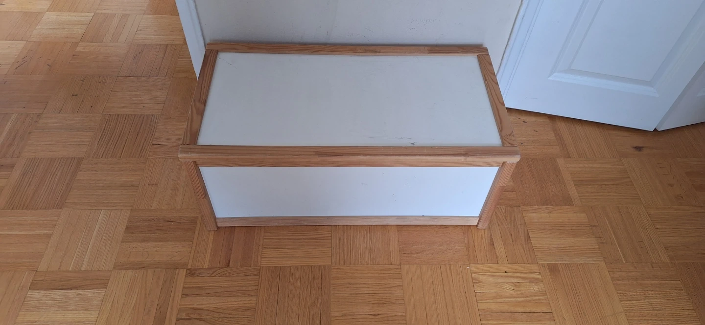This is a wooden storage box with a white front and lid. It's constructed with a wood frame and particle board panels. It would be useful for storing items like blankets or toys.
