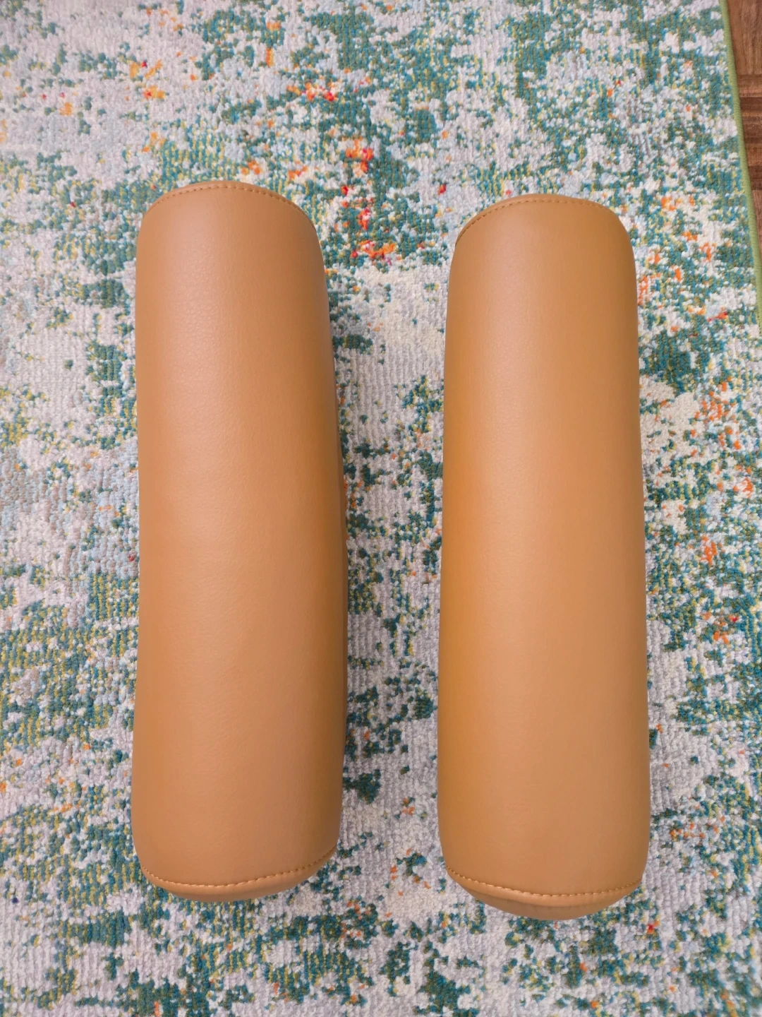 A pair of brown faux leather bolster pillows. These cylindrical pillows are covered in a smooth, tan-coloured faux leather material with visible stitching. They're great for adding comfort and support.