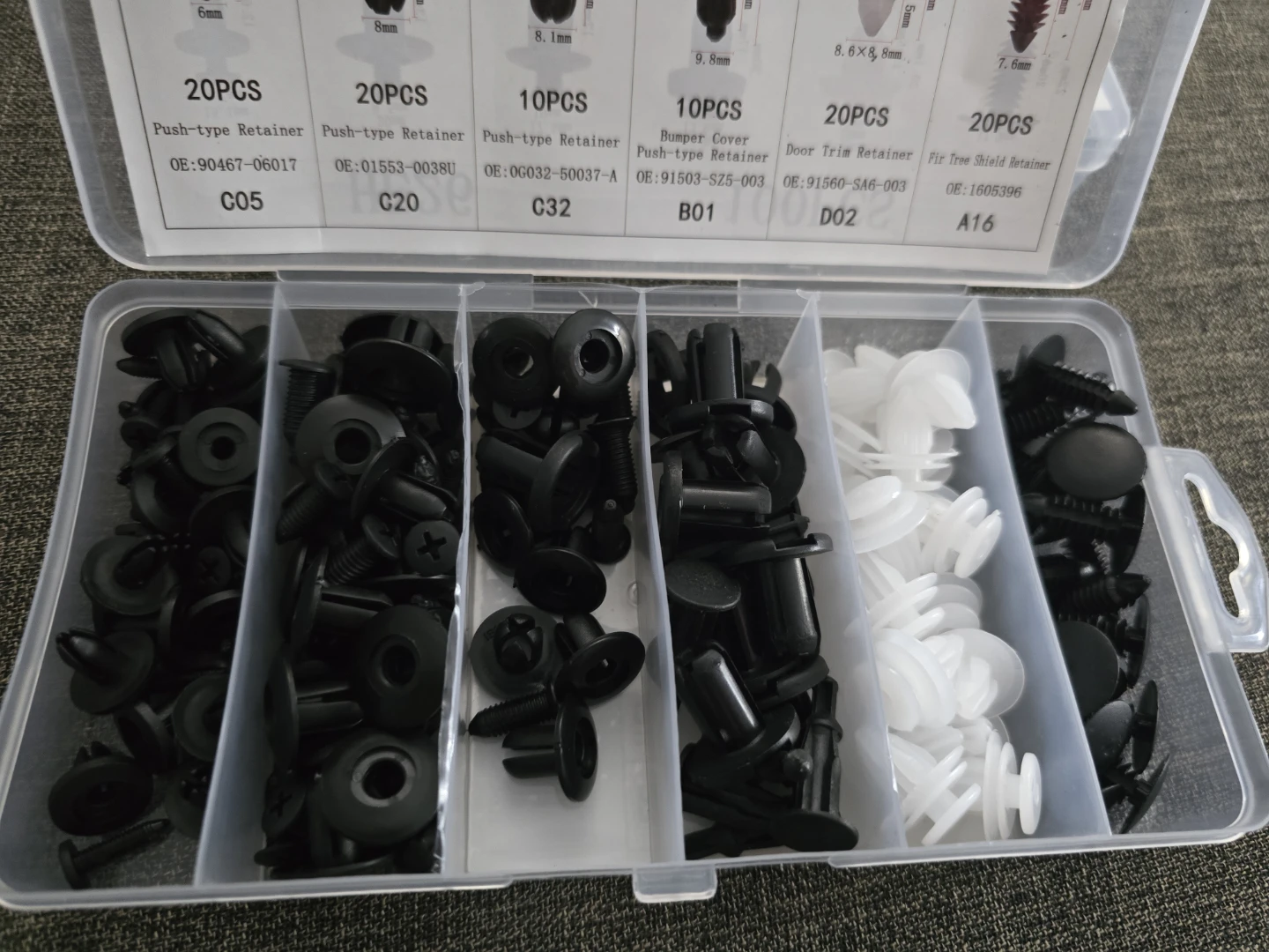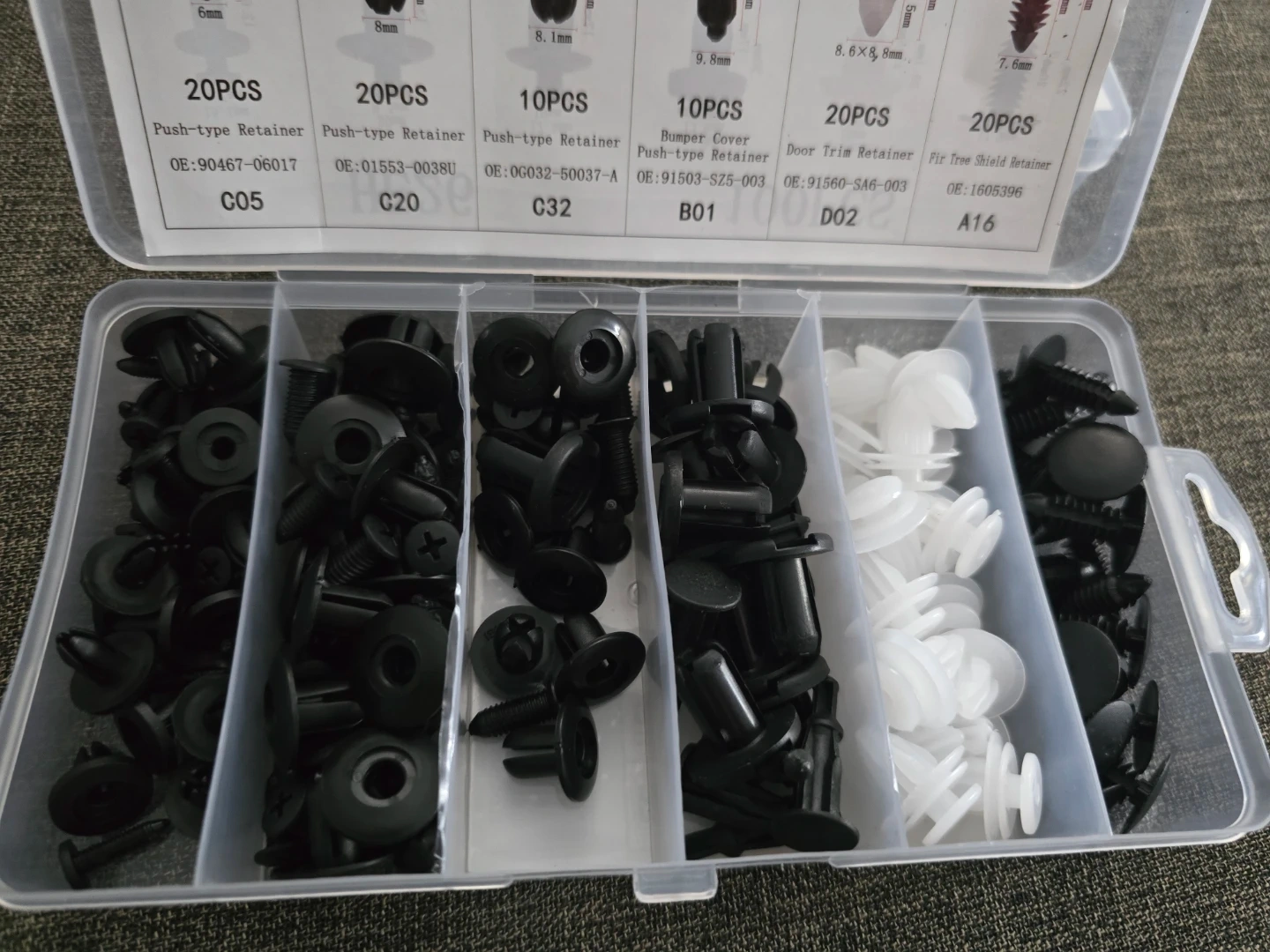 This assortment kit includes 100 assorted push-type retainers for auto use. It contains various sizes and types of clips, including bumper covers and fender shield retainers. These clips are made of durable plastic.