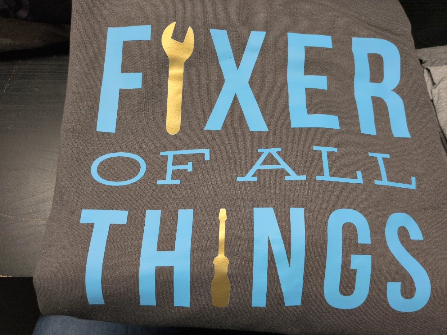 This is a "Fixer of All Things" graphic tee! Grey with light blue lettering and gold tool graphics. Brand new and ready for a home. Custom made.