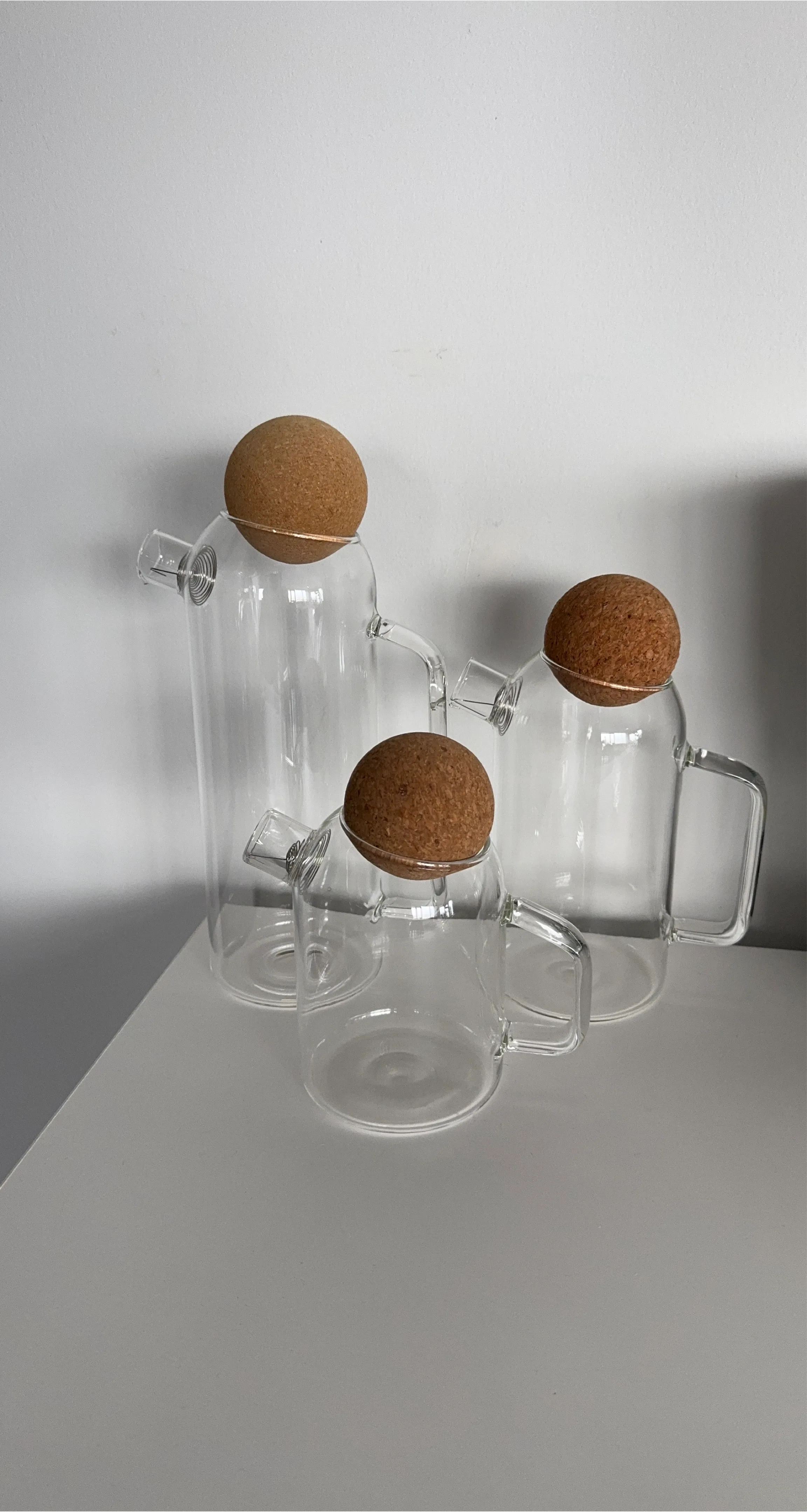 This set includes three clear glass teapots, each topped with a natural cork lid. The glass construction allows you to see the brewing process. They're great for serving tea or other beverages.