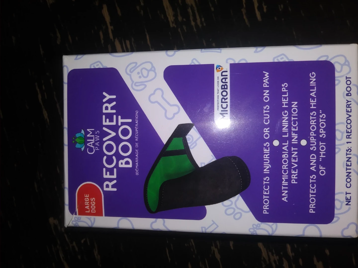 This recovery boot is designed to protect injuries or cuts on your dog's paw. It features an antimicrobial lining that helps prevent infection. The boot also protects and supports healing of "hot spots".
