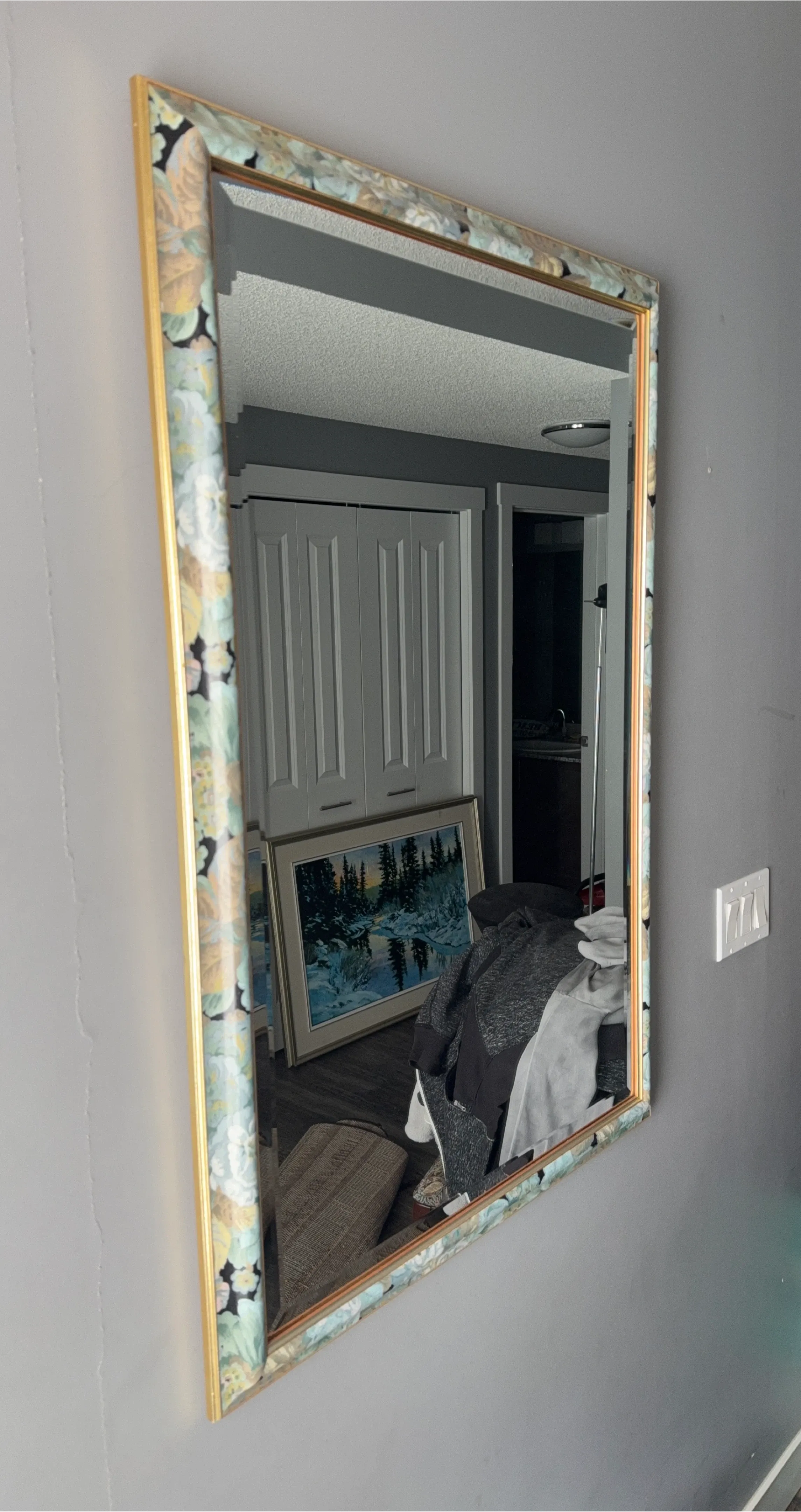 Selling a lovely framed wall mirror. The frame has a unique floral pattern with gold trim. It's in great condition and ready to brighten up any room!