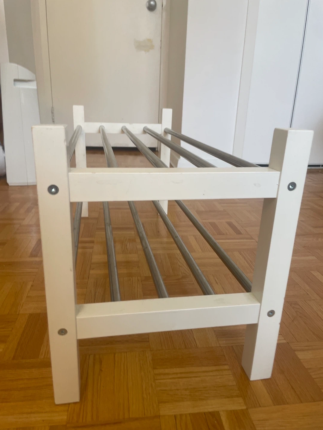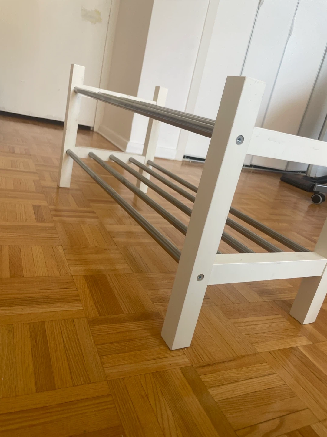 Selling a gently used IKEA Portis shoe rack. It's in great shape and perfect for keeping your entryway organized. The white and silver finish will match any decor. It's a sturdy and reliable piece!