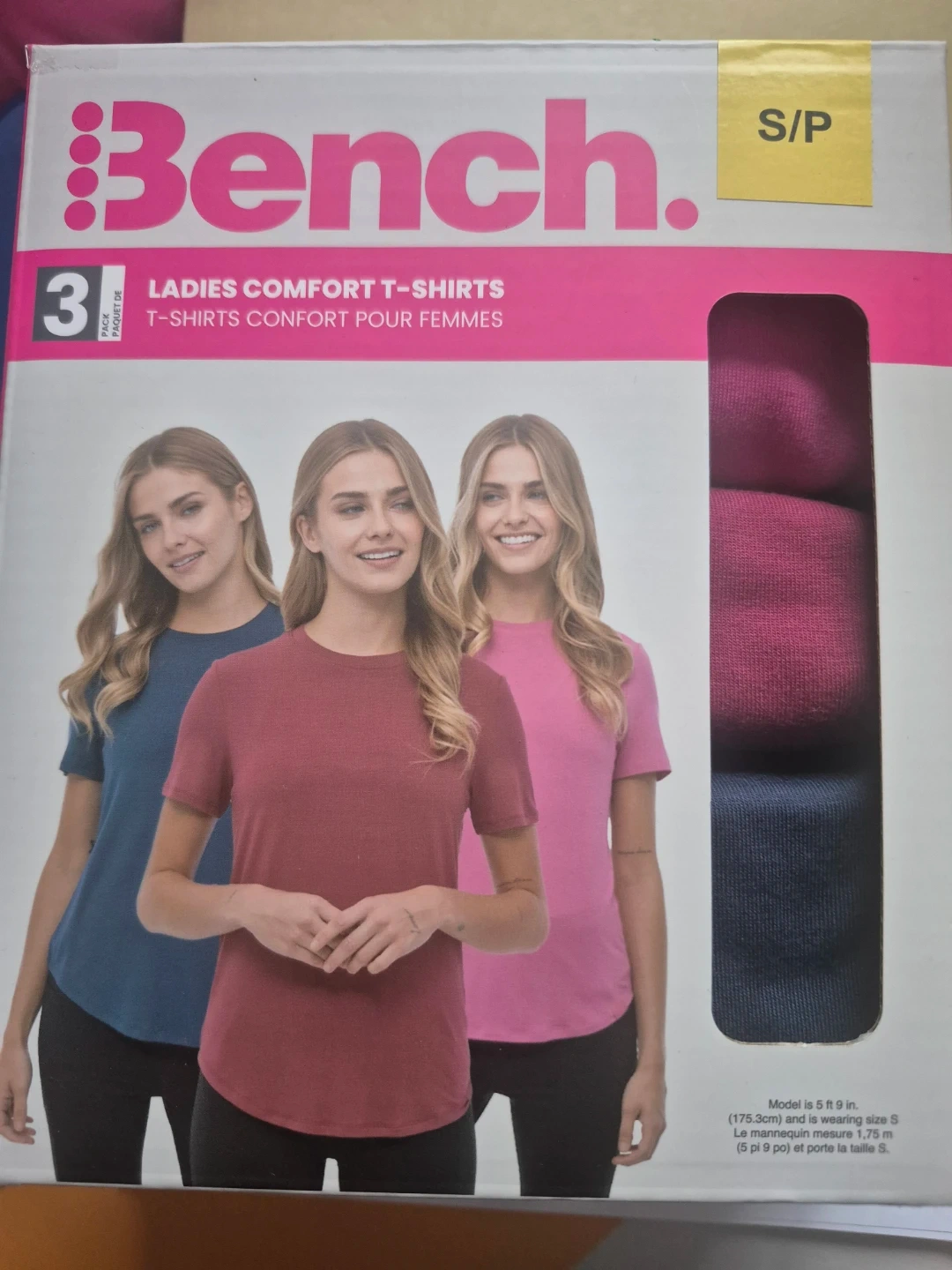 This pack includes three ladies comfort t-shirts from Bench. They are made with 89% modal, 9% recycled polyester, and 2% spandex. Machine wash cold. Available in size S/P.