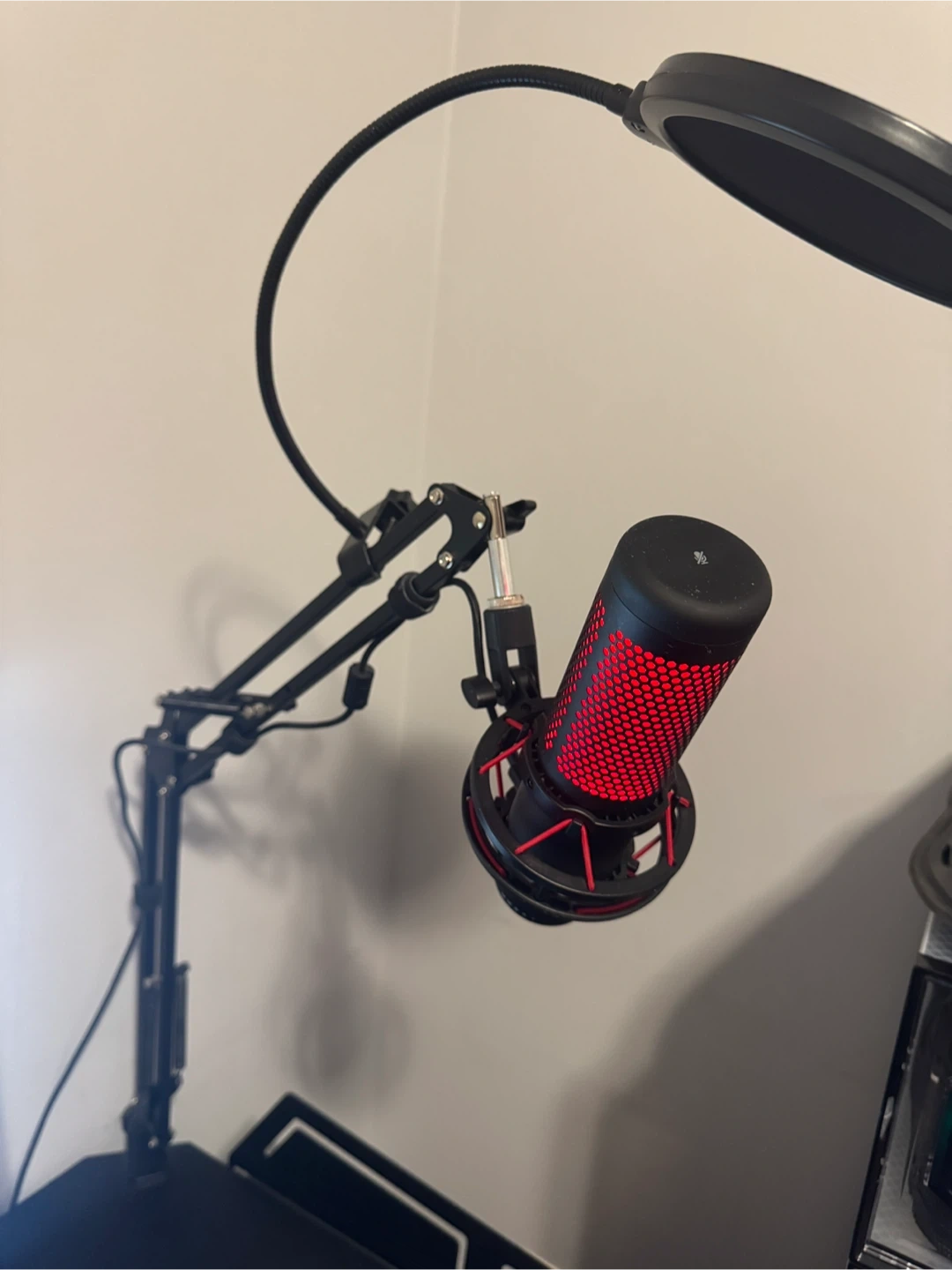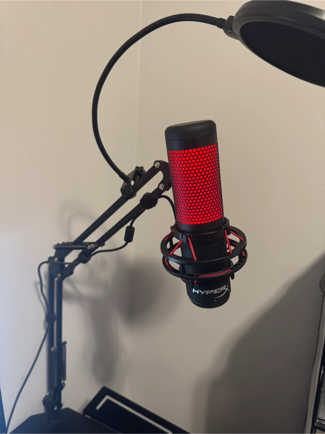 This HyperX QuadCast microphone is set up on a boom arm with a pop filter. It's a USB condenser mic with four polar patterns. The mic itself has red LED lighting. It's great for streaming or podcasting!
