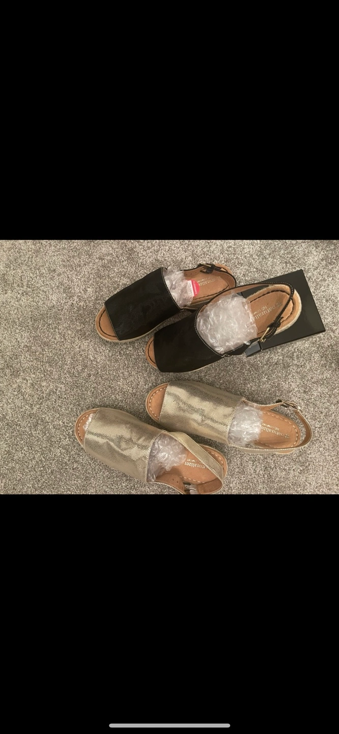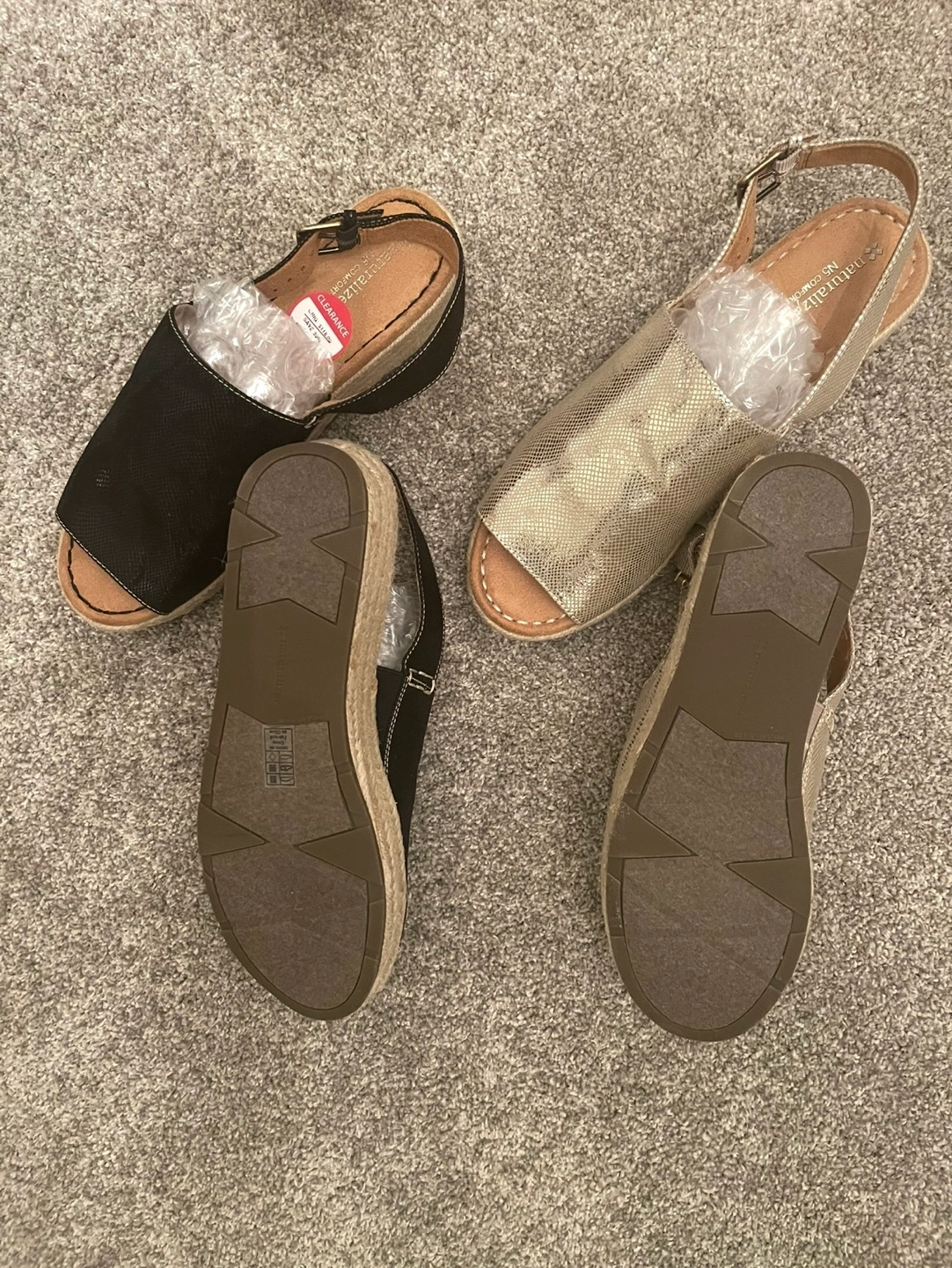 Selling a pair of brand new Naturalizer espadrille sandals! They're super cute and comfy for summer. One pair is black and the other is gold, both size 10. 1 for $60 and 2 for $110