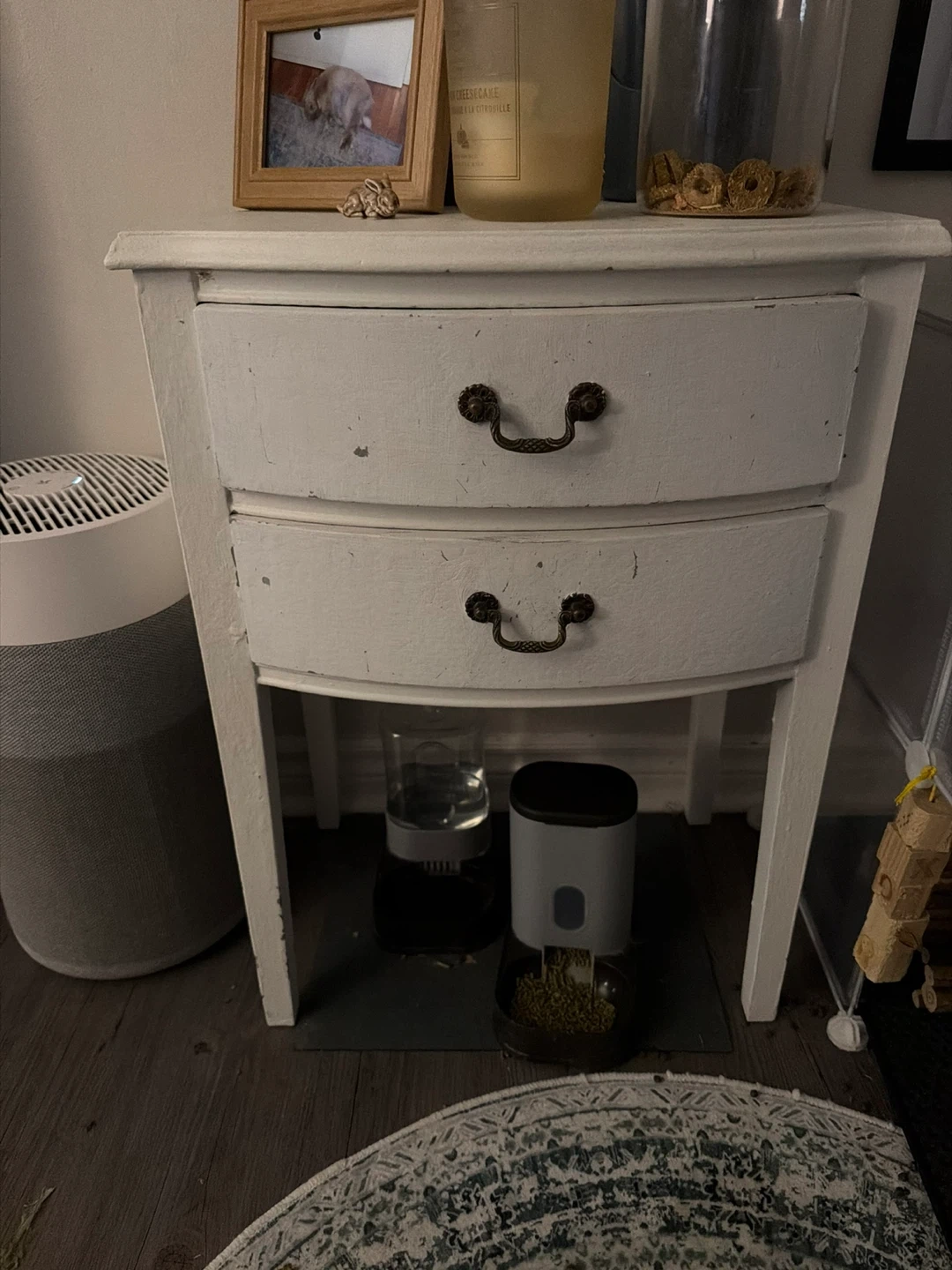I have a set of (2) charming white two-drawer nightstand. It features ornate drawer pulls and a slightly distressed finish. Perfect for adding a touch of vintage style to your bedroom. The nightstands could use a fresh coat of paint as they were previously painted.