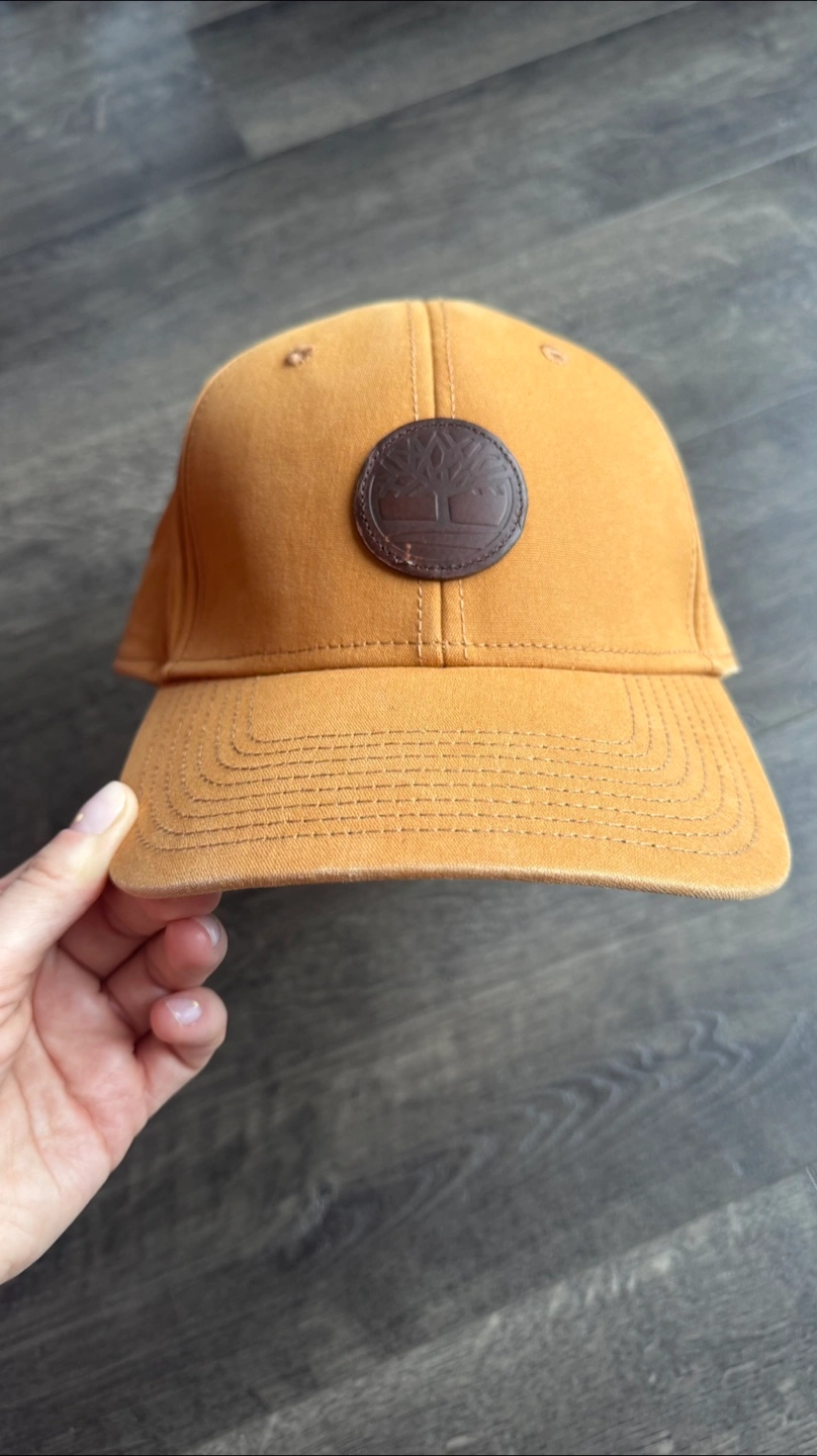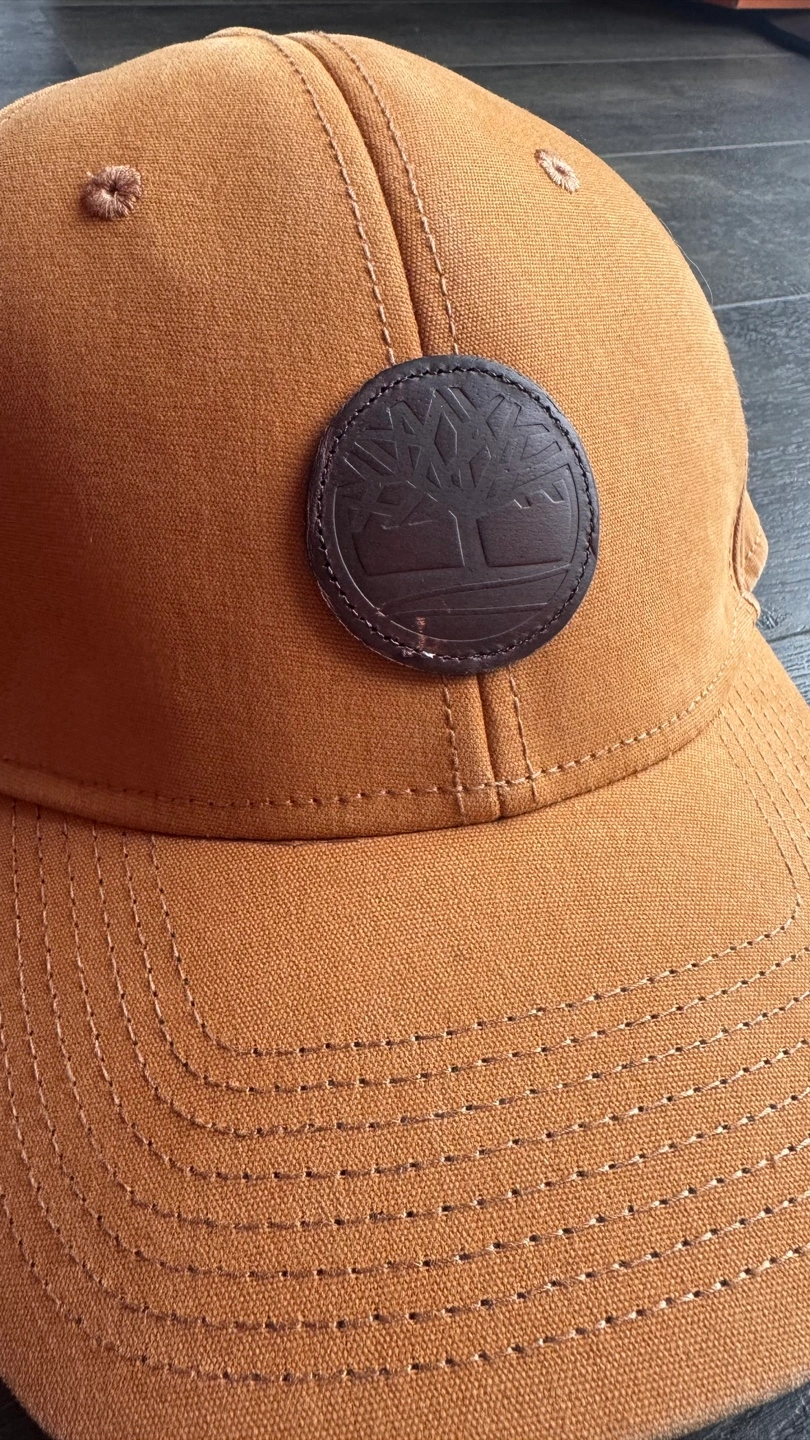 Men's or unisex Timberland baseball cap. Mustard yellow colour. Features a brown leather logo patch. 100% cotton. One size fits most.