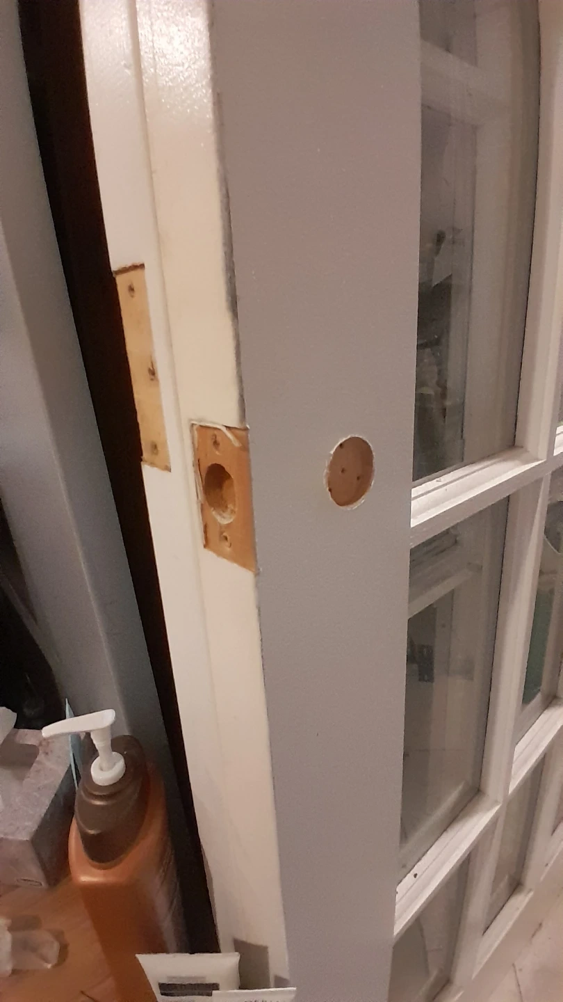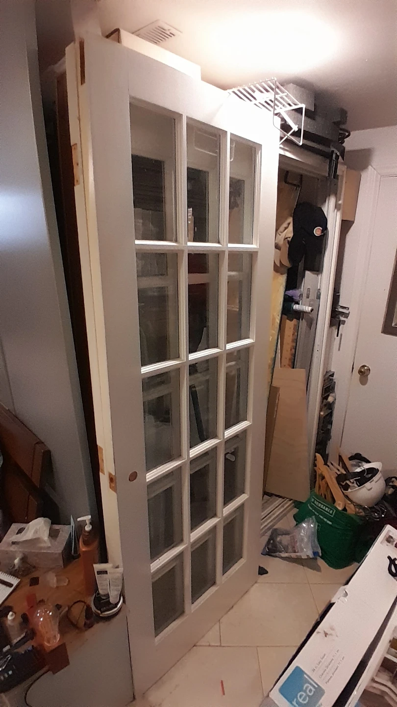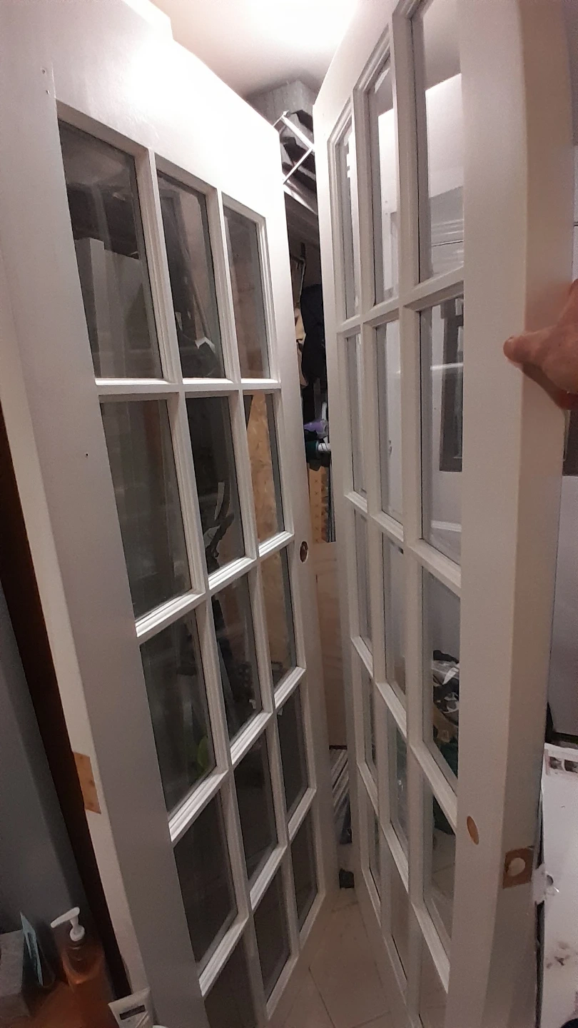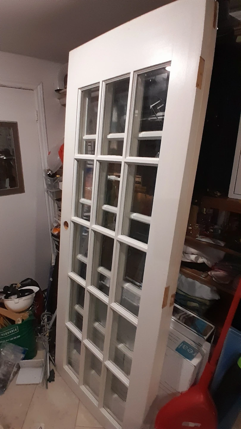 White interior doors with glass panels. Door width approximately 30 inches, height around 80 inches. Comes with pre-drilled hardware holes.