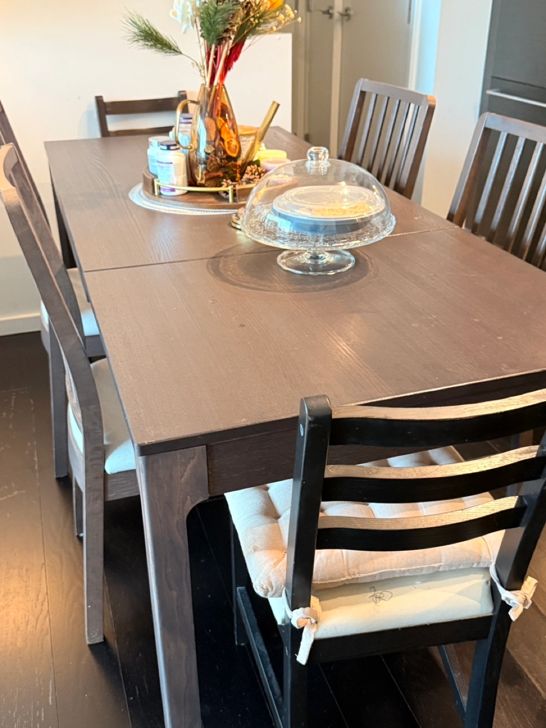 A durable dining table that makes it easy to have big dinners. A single person can extend the table and there’s plenty of room for chairs since the legs are always located at the corners of the table.