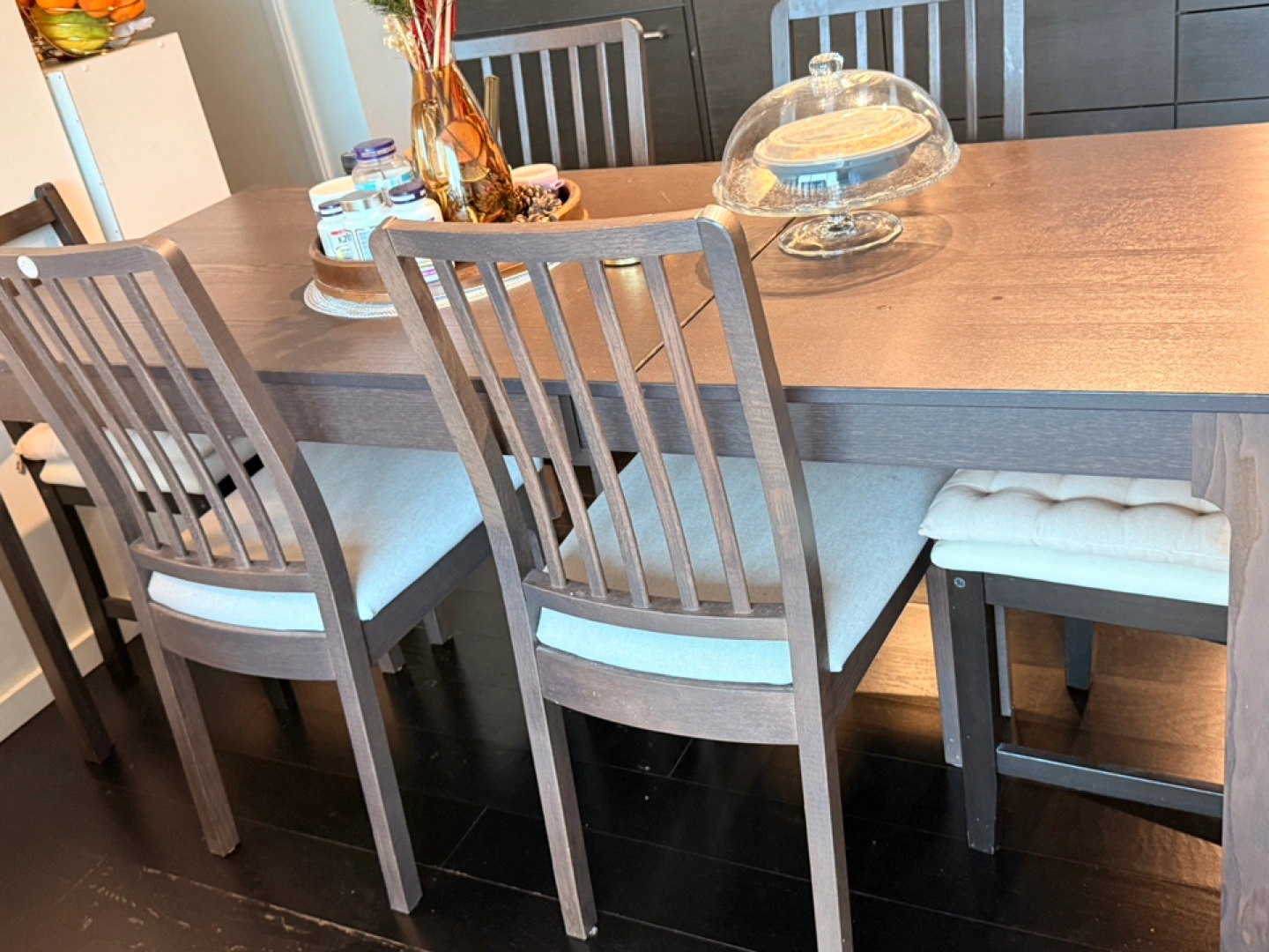 A durable dining table that makes it easy to have big dinners. A single person can extend the table and there’s plenty of room for chairs since the legs are always located at the corners of the table.