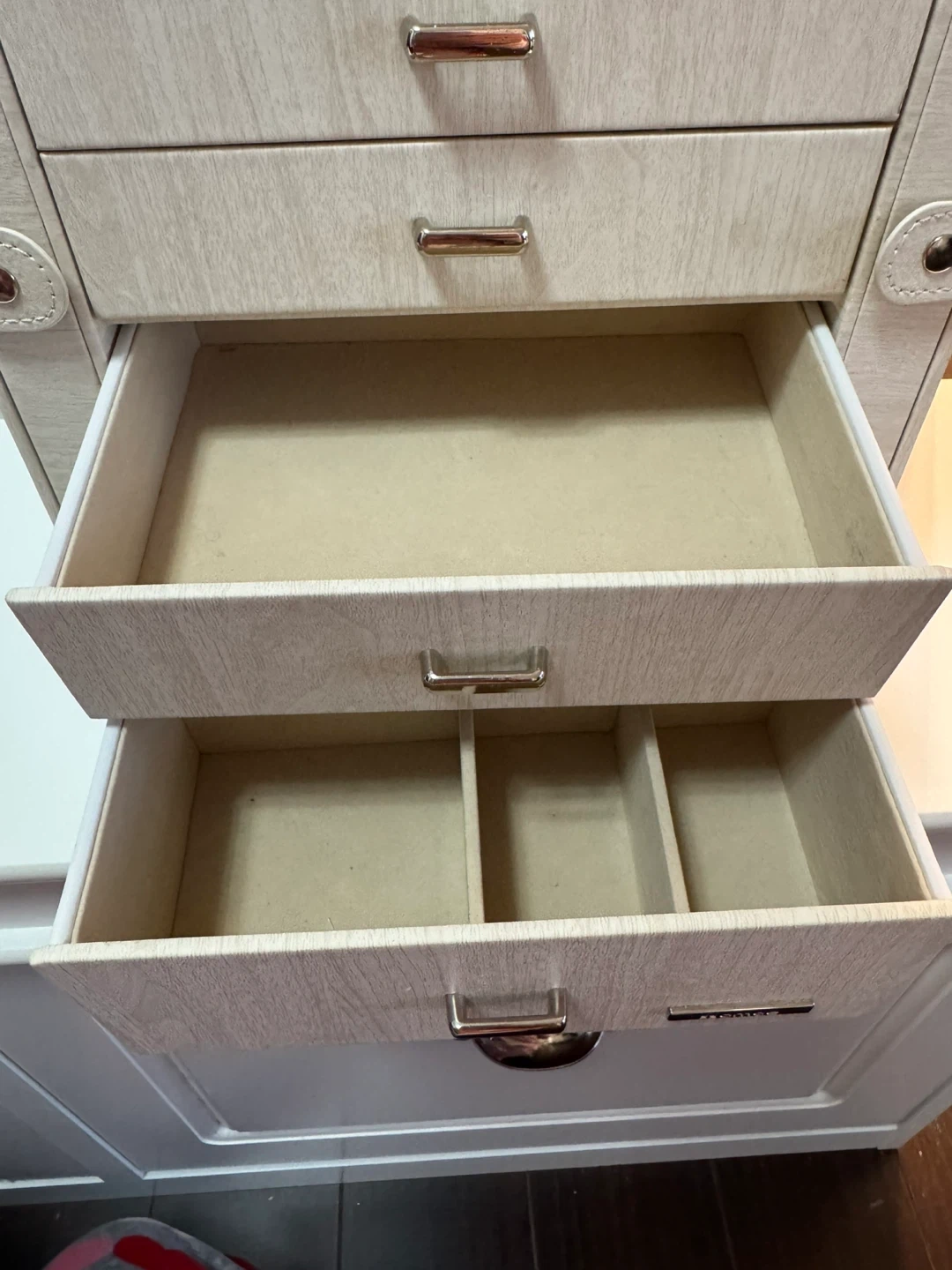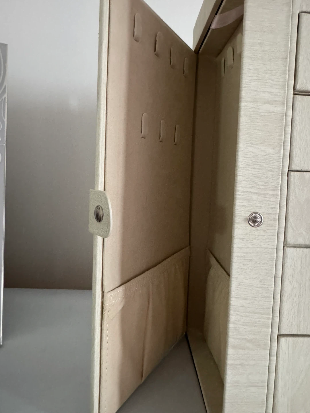 This cream jewelry box offers ample storage with a mirror inside the lid. It features multiple compartments and ring rolls on the top tier, plus five drawers for organizing your you accessories.