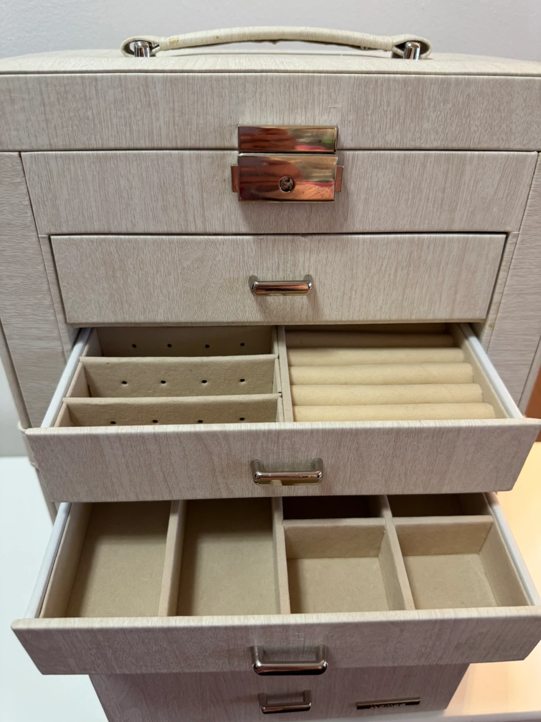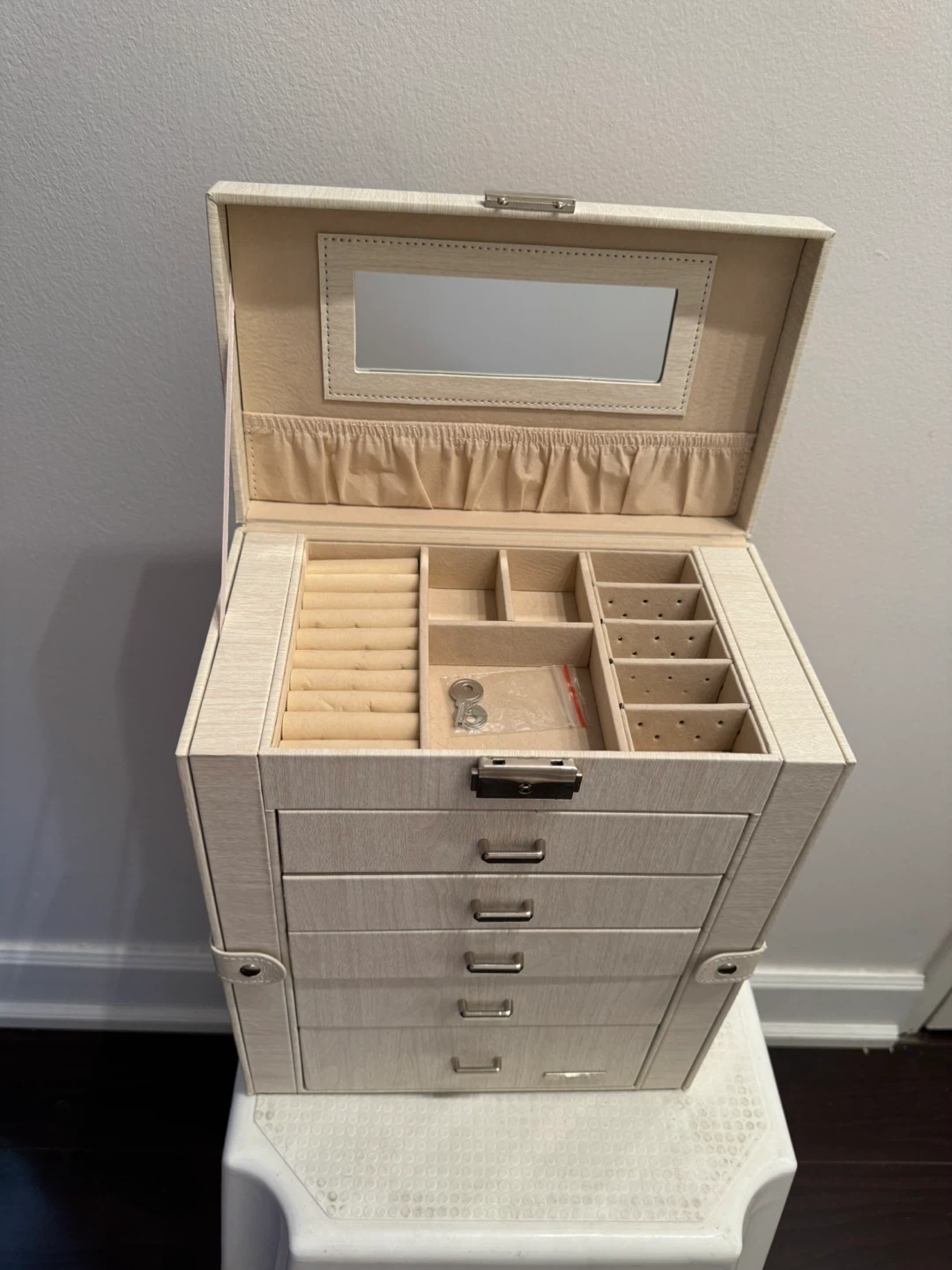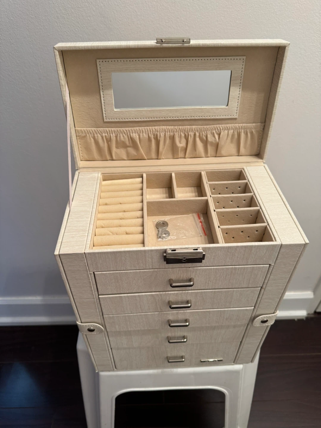 This cream jewelry box offers ample storage with a mirror inside the lid. It features multiple compartments and ring rolls on the top tier, plus five drawers for organizing your you accessories.