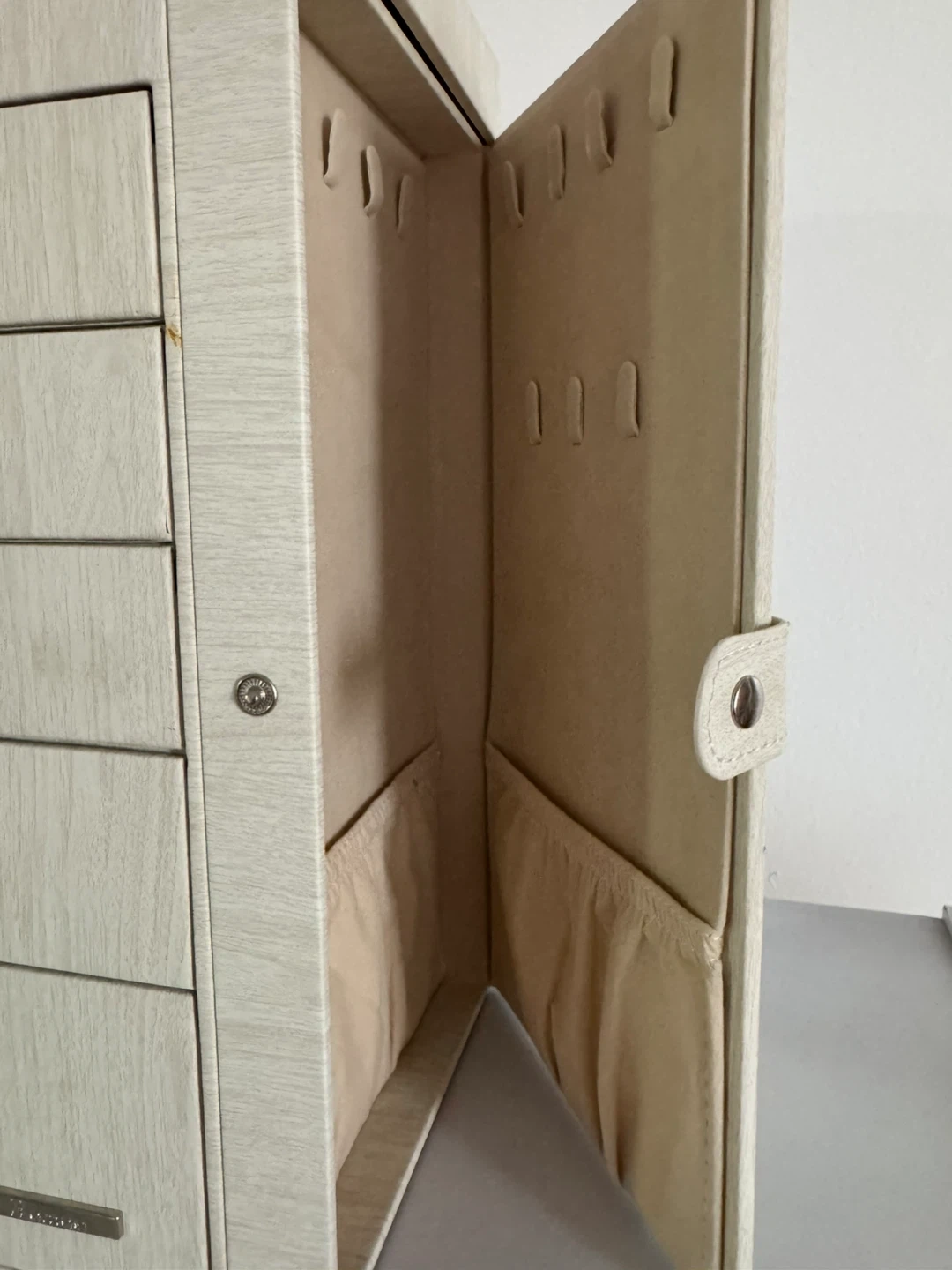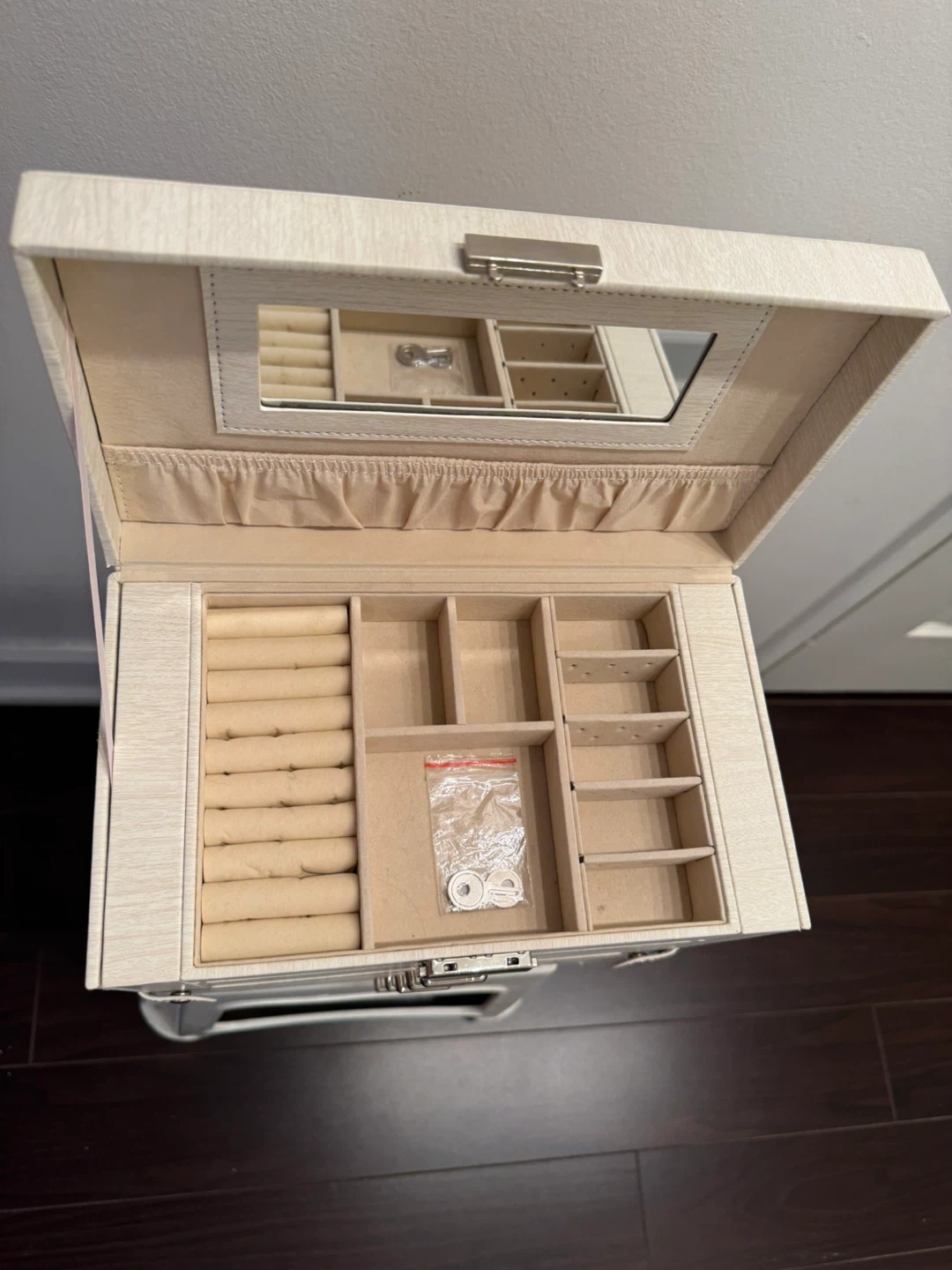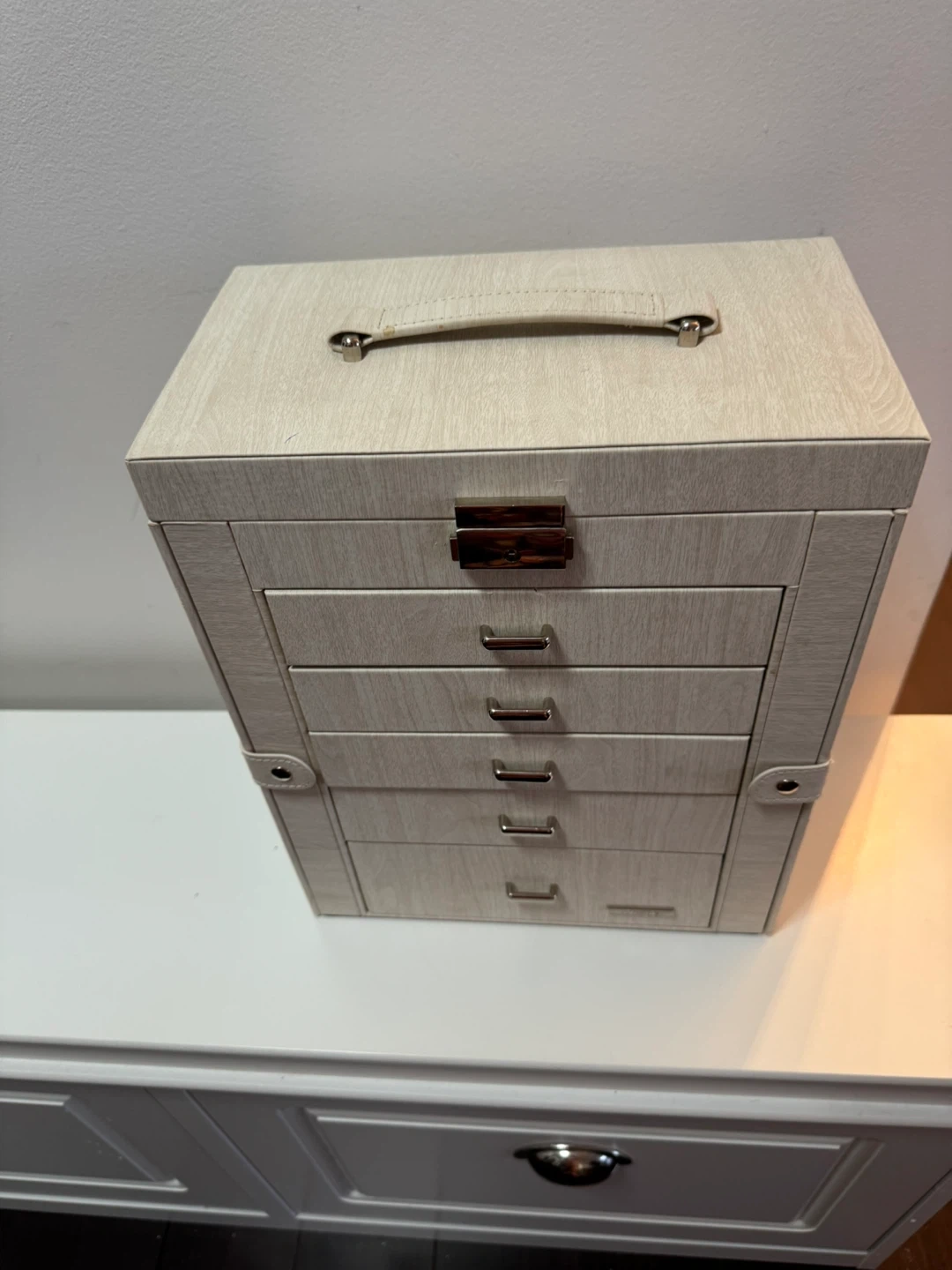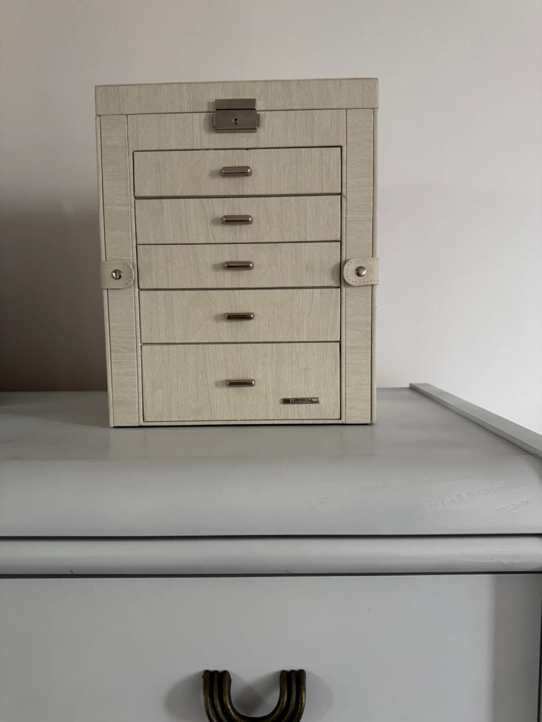 This cream jewelry box offers ample storage with a mirror inside the lid. It features multiple compartments and ring rolls on the top tier, plus five drawers for organizing your you accessories.