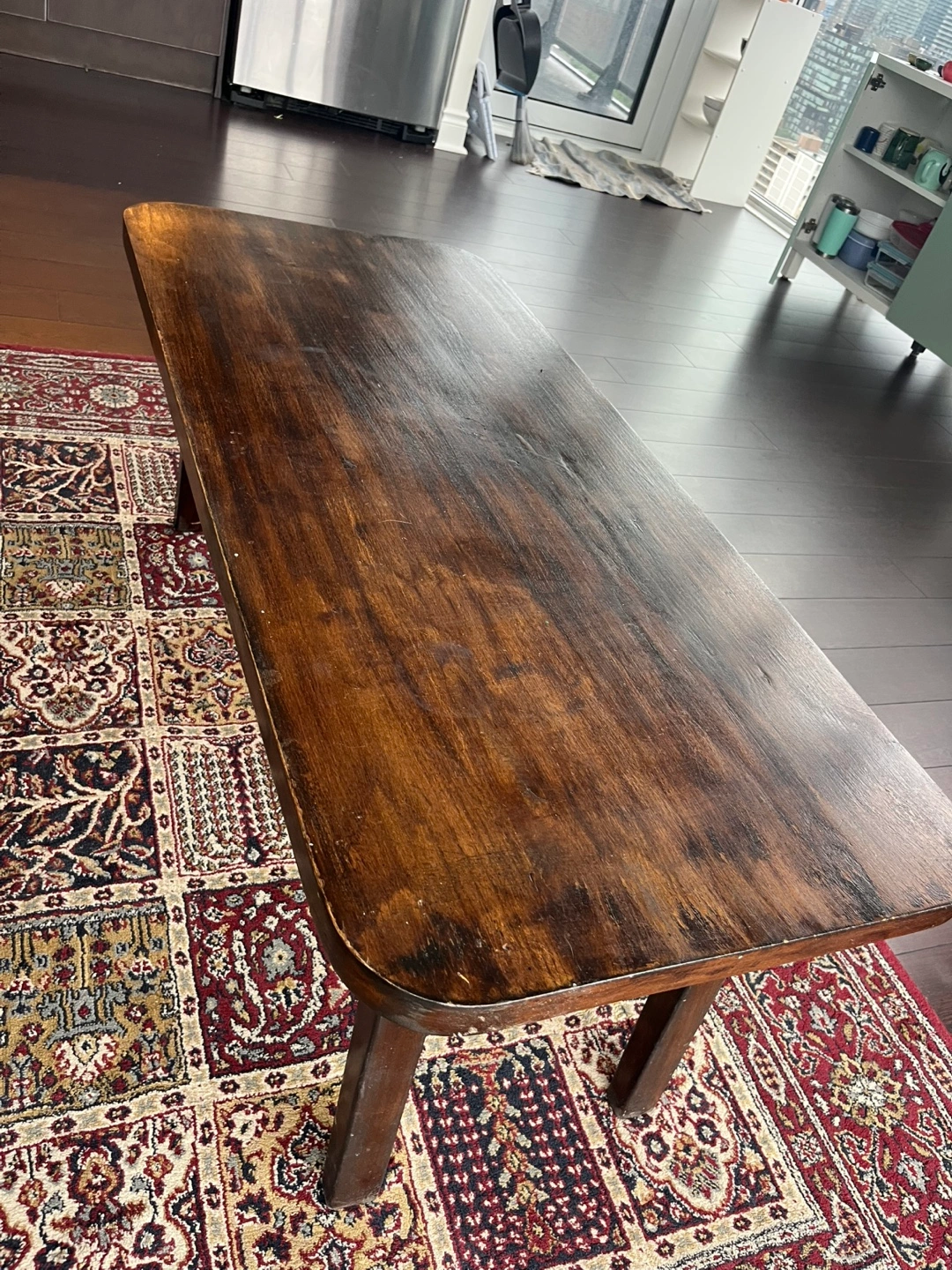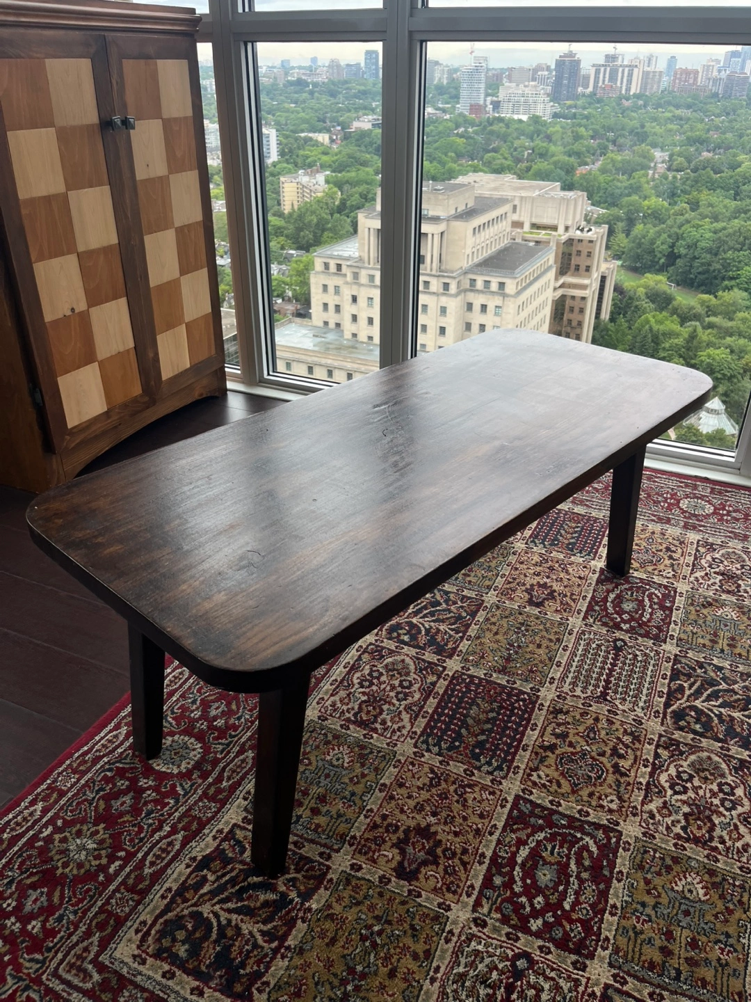 Selling a used wooden coffee table, it's nice and sturdy with minimal damage. Beautiful dark brown wood in color, elongated rectangle shape. DM for measurements