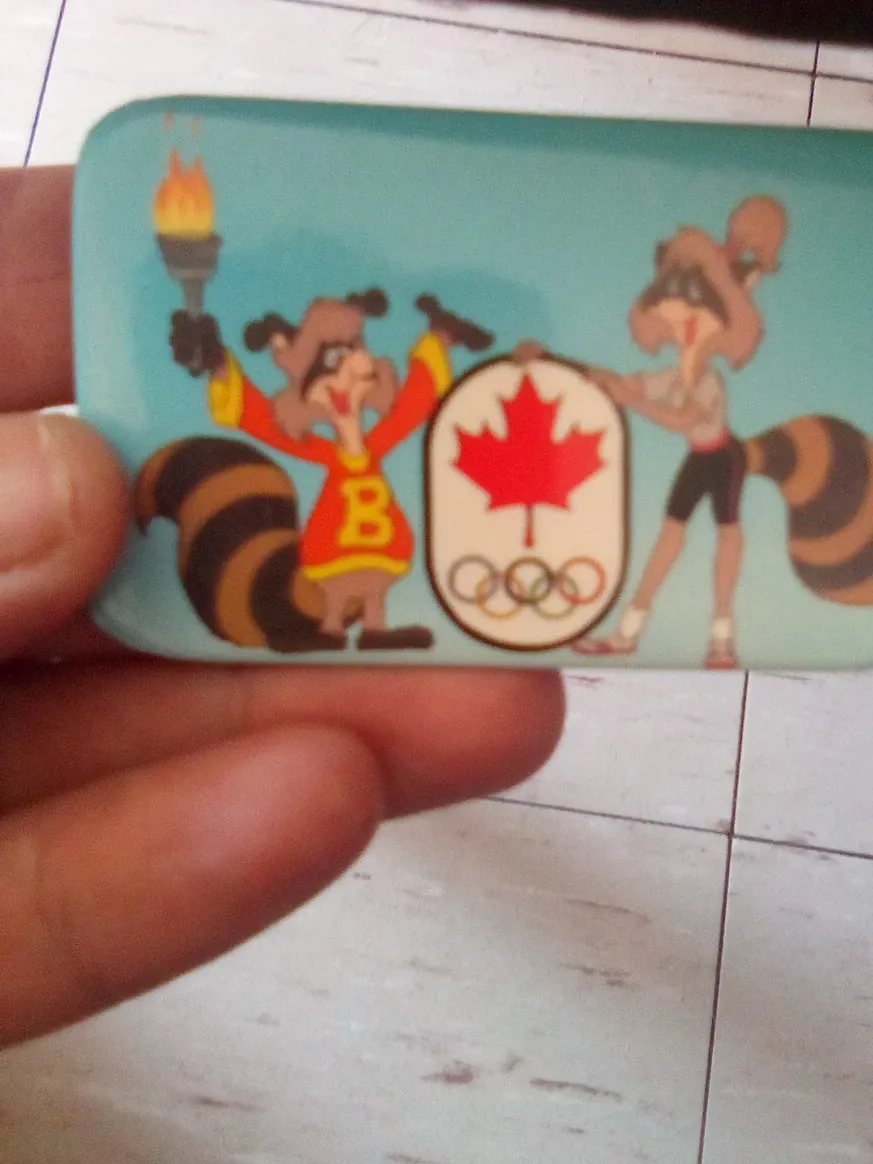 Vintage Olympic-themed pin featuring cartoon raccoons. It displays a Canadian maple leaf and the Olympic rings. A fun collectible from a past Games!