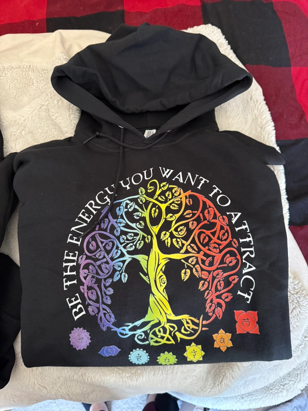 Selling a black hoodies featuring a colourful Tree of Life design on the front and a white Om symbol on the front.