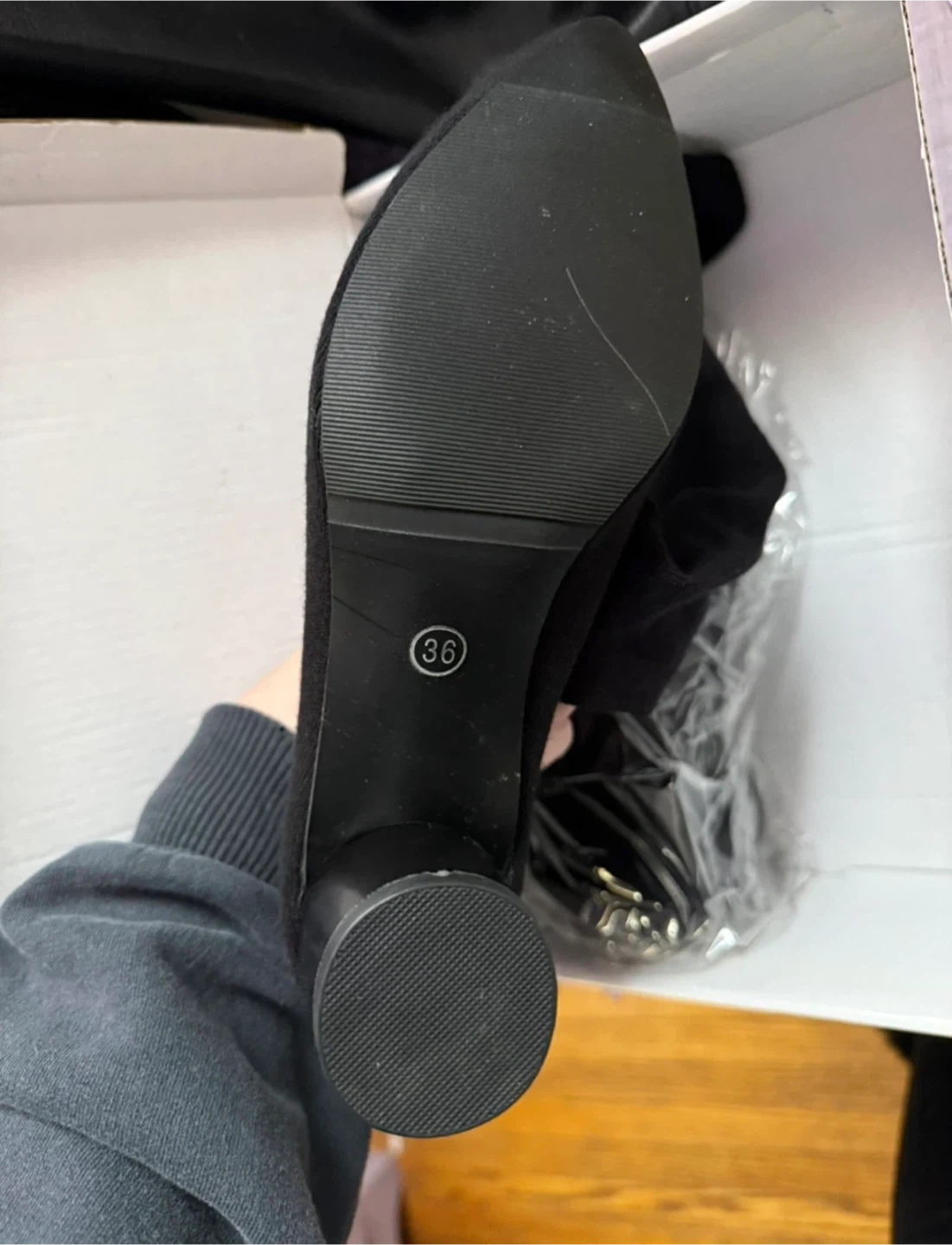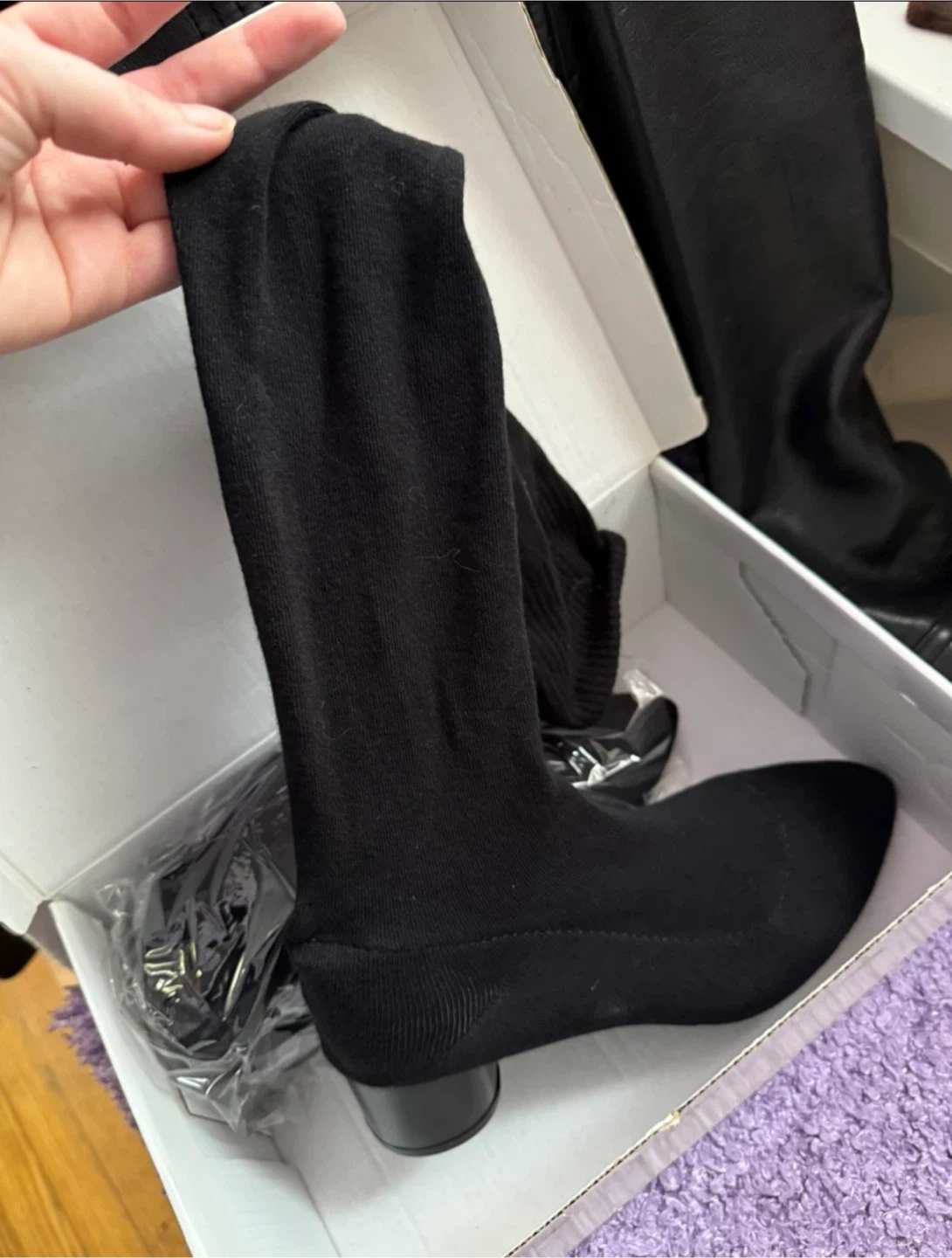These black knee-high boots are a size 36. They have a pointed toe and a block heel. The material appears to be a knit fabric. Never worn.