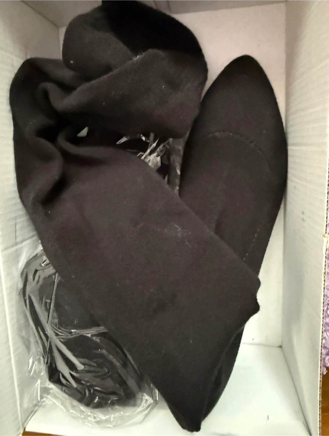These black knee-high boots are a size 36. They have a pointed toe and a block heel. The material appears to be a knit fabric. Never worn.